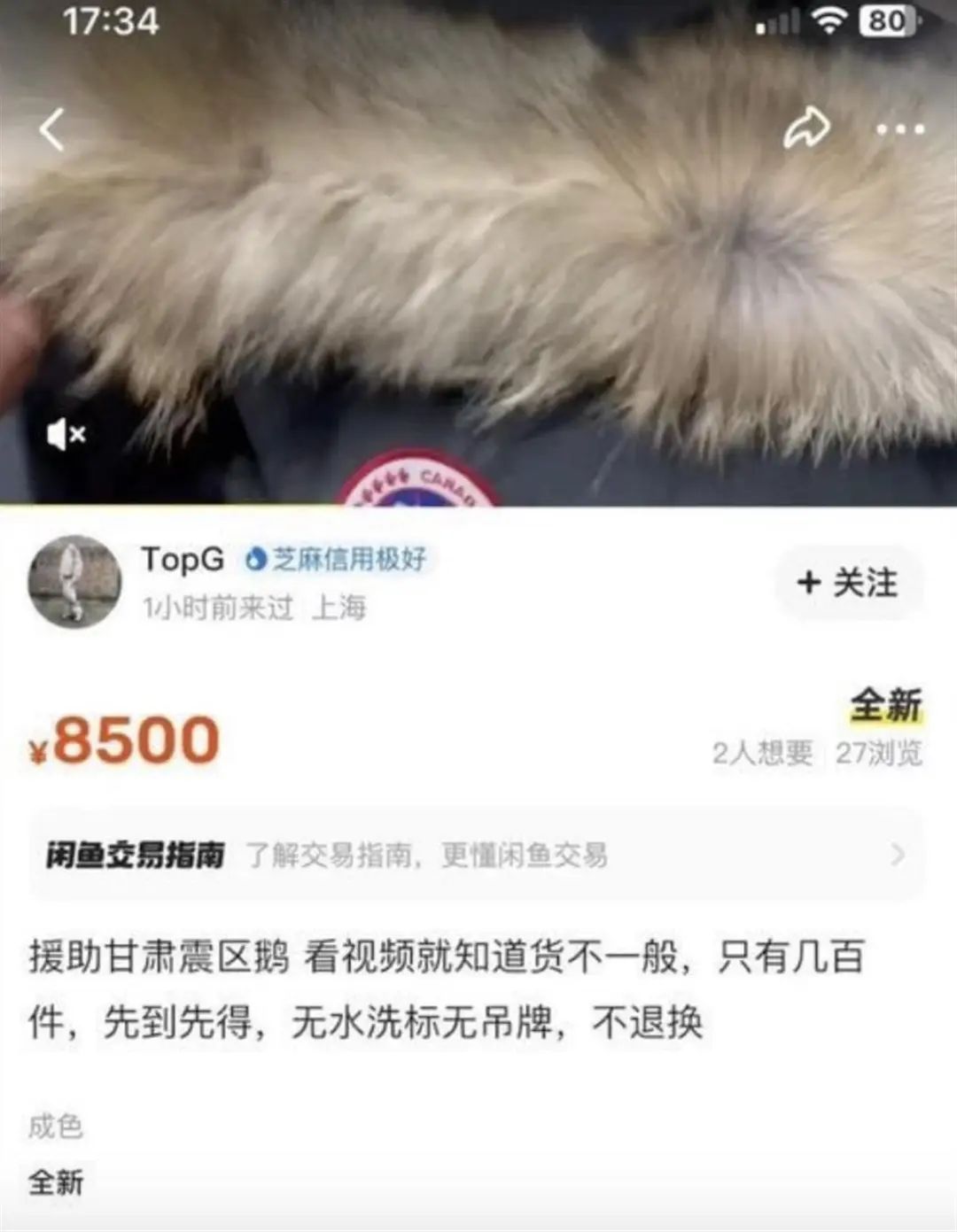 12月26日,有网友在社交平台晒图称,加拿大鹅驰援甘肃震区的部分羽绒服,疑似流入二手平台闲鱼被倒卖。这张截图的商品信息显示为:“援助甘肃震区鹅,看视频就知道货不一般,只有几百件,先到先得,无水洗标无吊牌,不退换。”截图上,卖家还为该款羽绒服标价8500元。