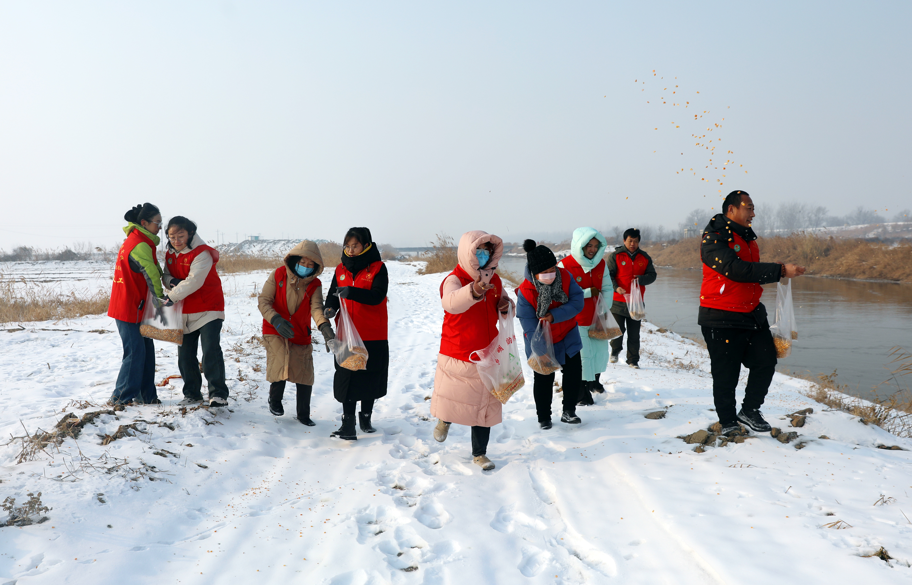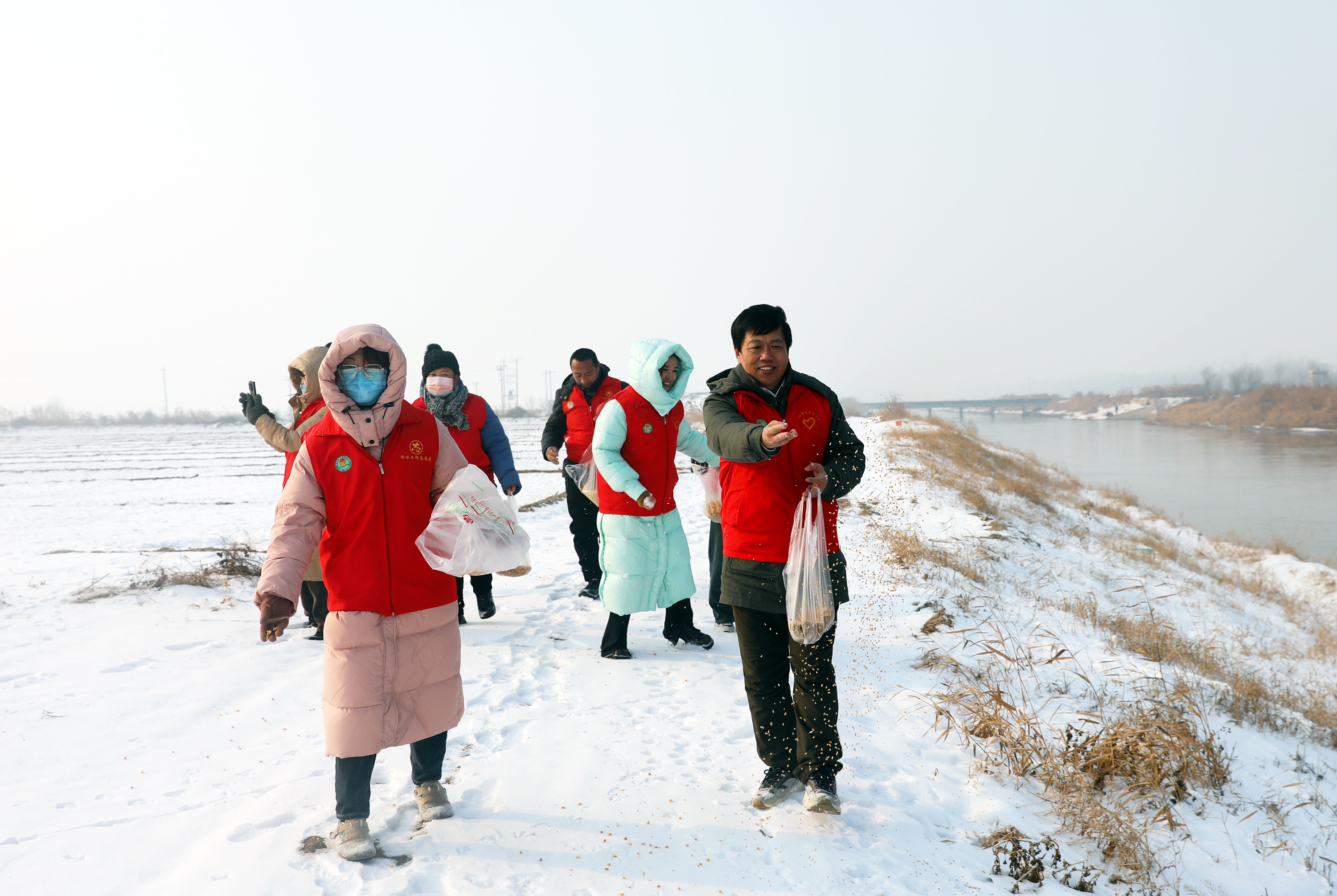12月26日,衡水市春晖义工协会与衡水市上善社工服务中心的志愿者们一起,来到衡水湖畔的滏阳新河浅滩上,为因湖面冰封觅食困难的鸟儿投食。