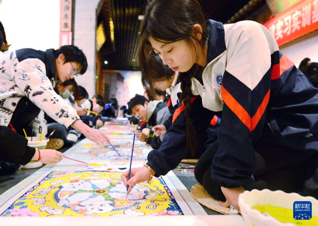 12月27日,武强县职教中心的学生在武强年画博物馆内创作年画作品。