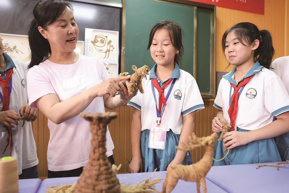 在迁西县实验小学的“非遗”课堂上,栗花手工艺制作人李秀云向师生们介绍栗花编织的种类和技巧。 李少华 摄
