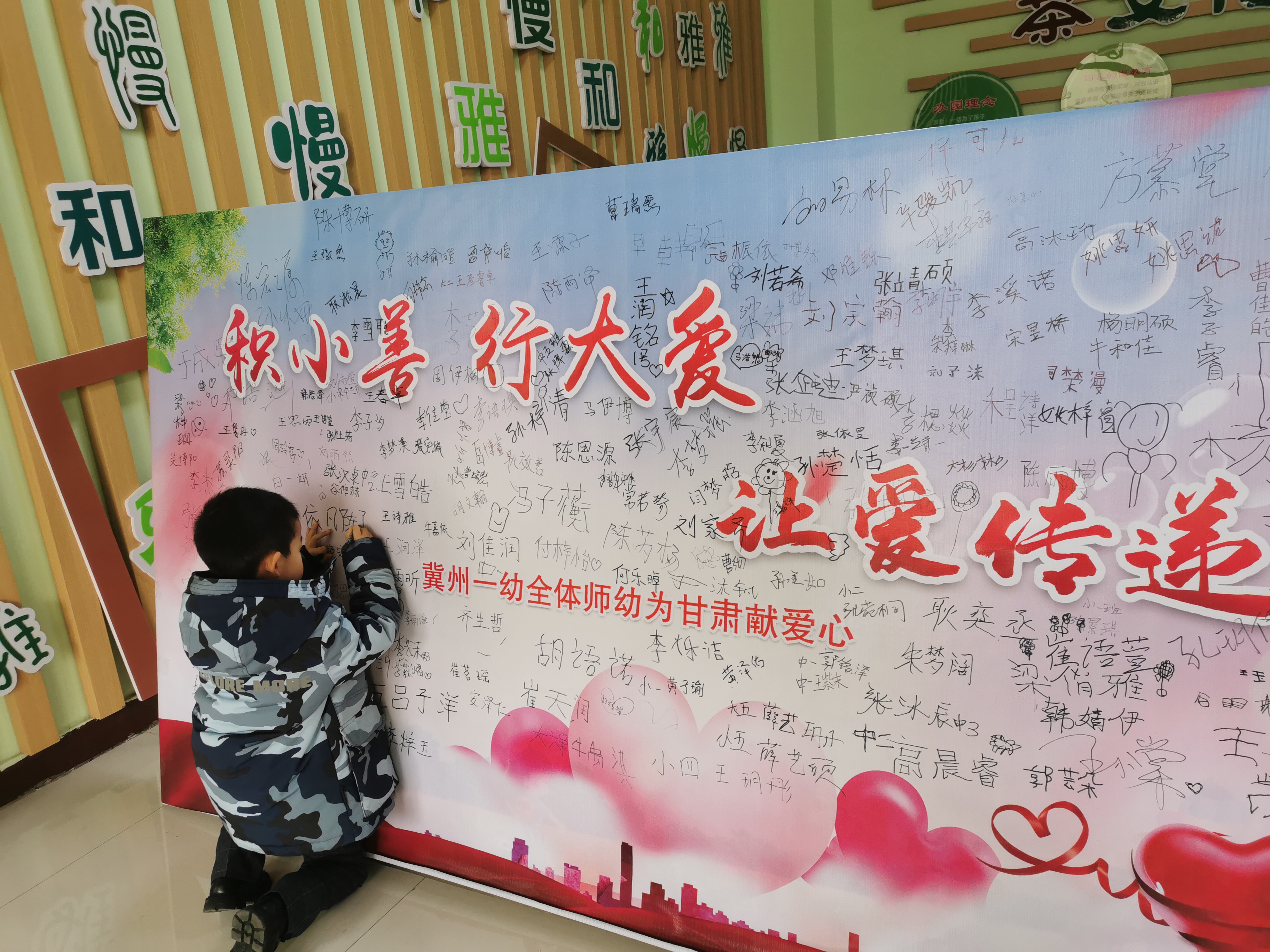 在辞旧迎新的欢乐时刻,孩子们没有忘记因地震受灾的小朋友们,他们带着深深的爱与牵挂,把自己的零花钱郑重地放入乐捐箱,在签名板上写下自己的名字。积小善,行大爱,让爱传递。