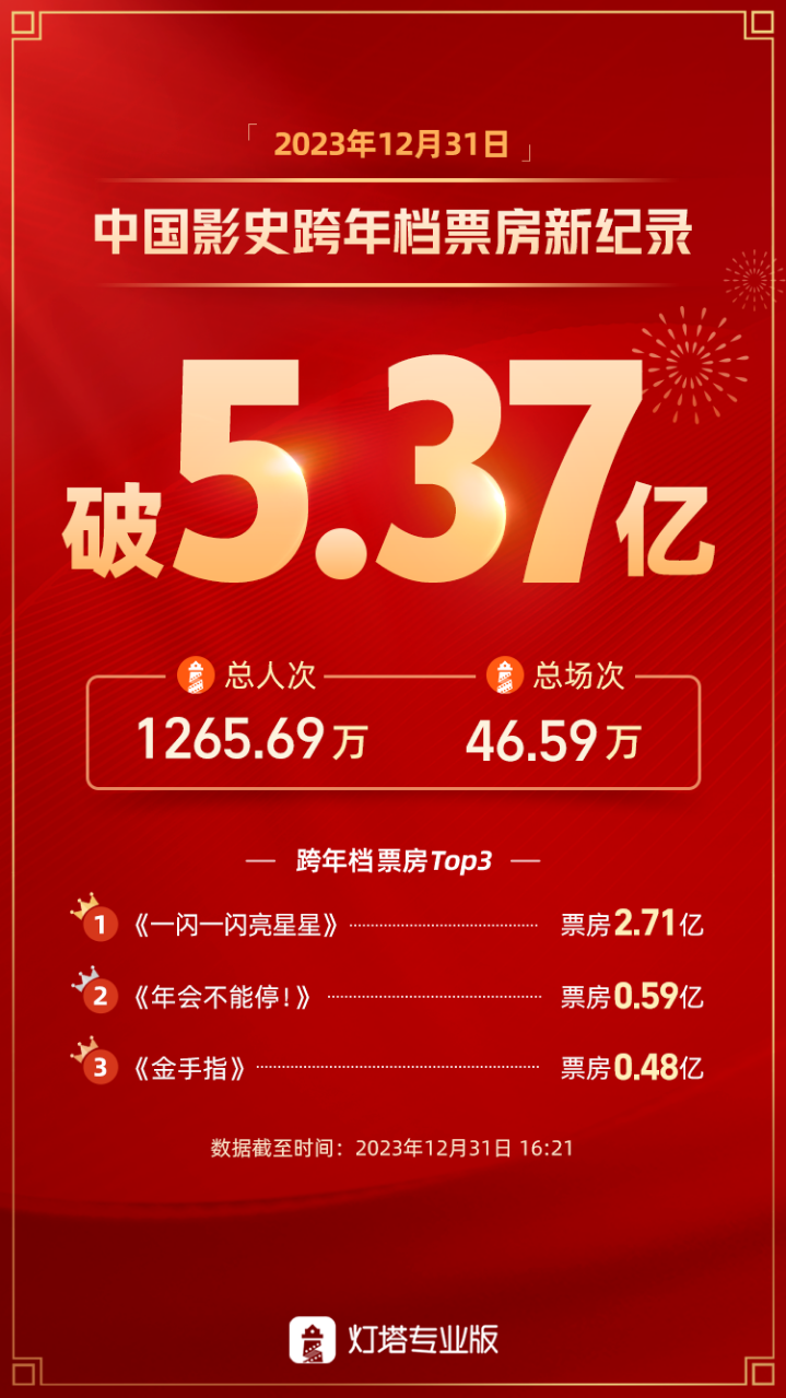 据灯塔专业版数据,截至12月31日16时21分,2023跨年档总票房超5.37亿元,打破中国影史跨年档最高票房纪录。跨年档票房排名前三的电影,分别是《一闪一闪亮星星》《年会不能停!》《金手指》。另据猫眼专业版数据,12月31日15时02分,跨年档单日票房破5亿元,这是继8月6日以后,时隔146天单日大盘票房再破5亿元。