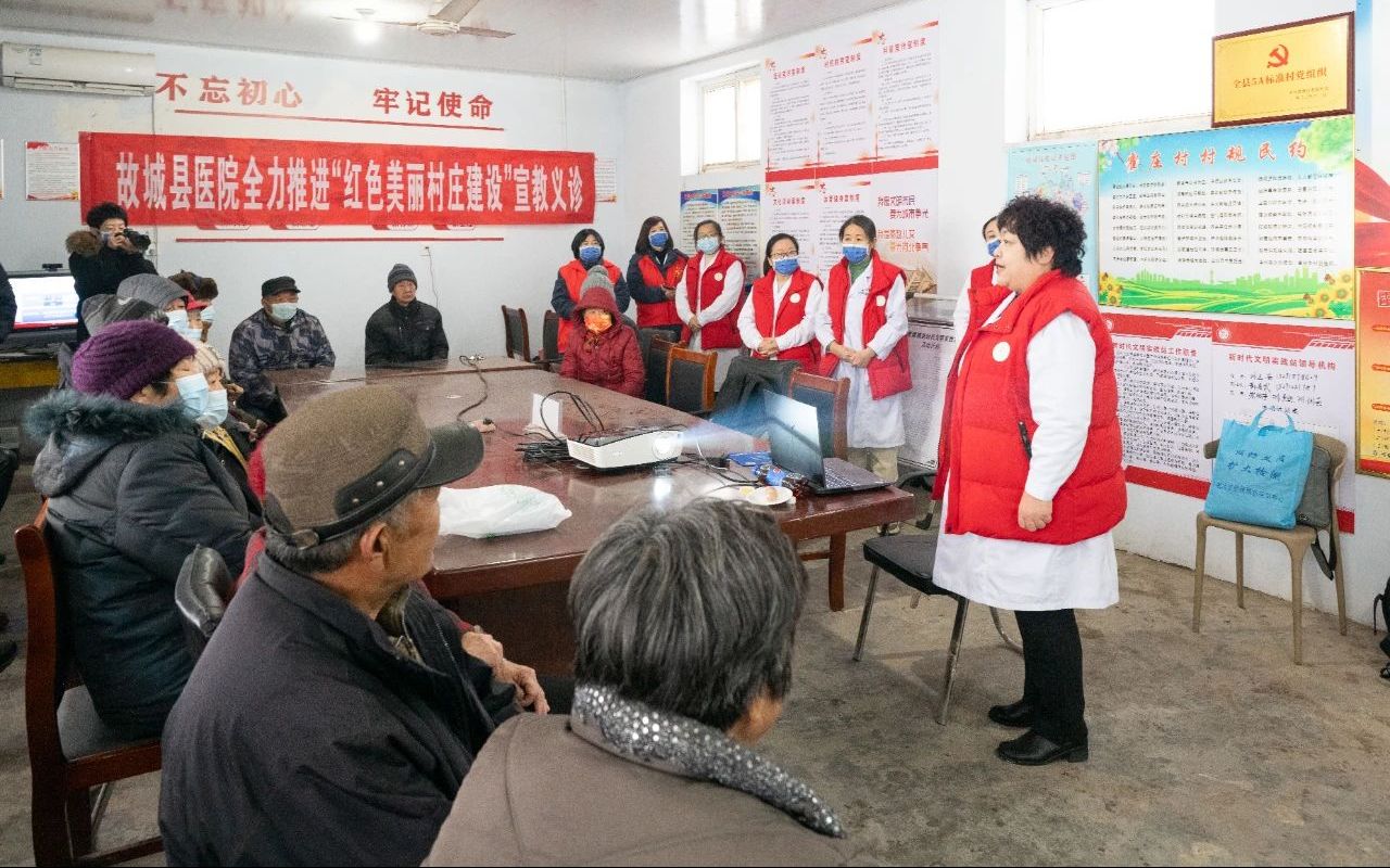 故城县霍庄村是一个远近闻名的英雄村,是省委组织部确定的48个推动红色村组织、振兴建设红色美丽村庄之一。居艳梅是党的二十大代表、全国优秀共产党员,作为向霍庄村选派“党建加强班”中的模范人物,她充分发挥示范带动作用,带领专家团队免费为前来咨询的群众测血糖、血压、超声、心电图等健康检查,讲解高血压、高血糖等常见疾病的控制方法。