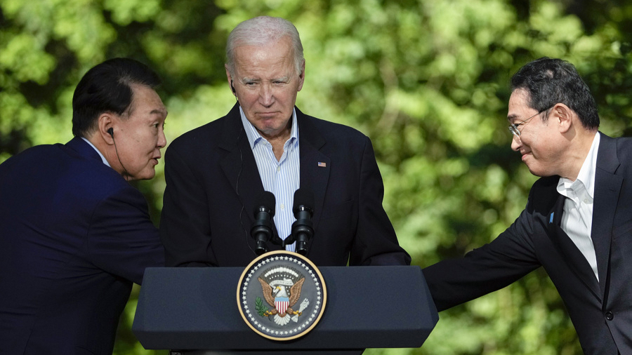 资料图:当地时间2023年8月18日,美国马里兰州戴维营,美国总统拜登与韩国总统尹锡悦、日本首相岸田文雄握手(来源:澎湃新闻)