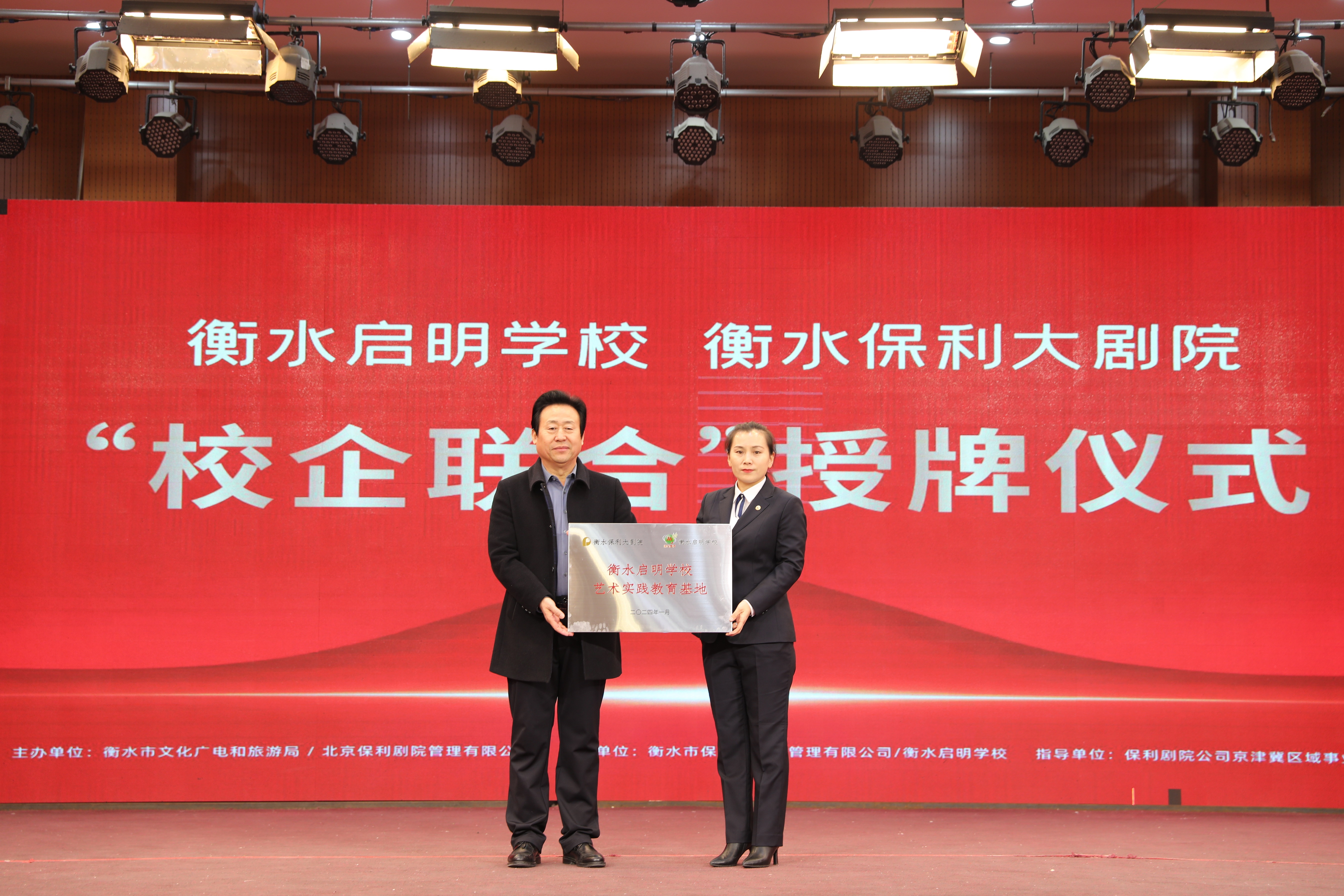 学校报告厅内,启明学校校长及衡水保利大剧院代表分别代表两方举行授牌仪式并合影留念。授牌仪式的举办,标志着衡水保利大剧院与启明学校正式携手共进,实现艺术资源共享,推动衡水文化繁荣发展。