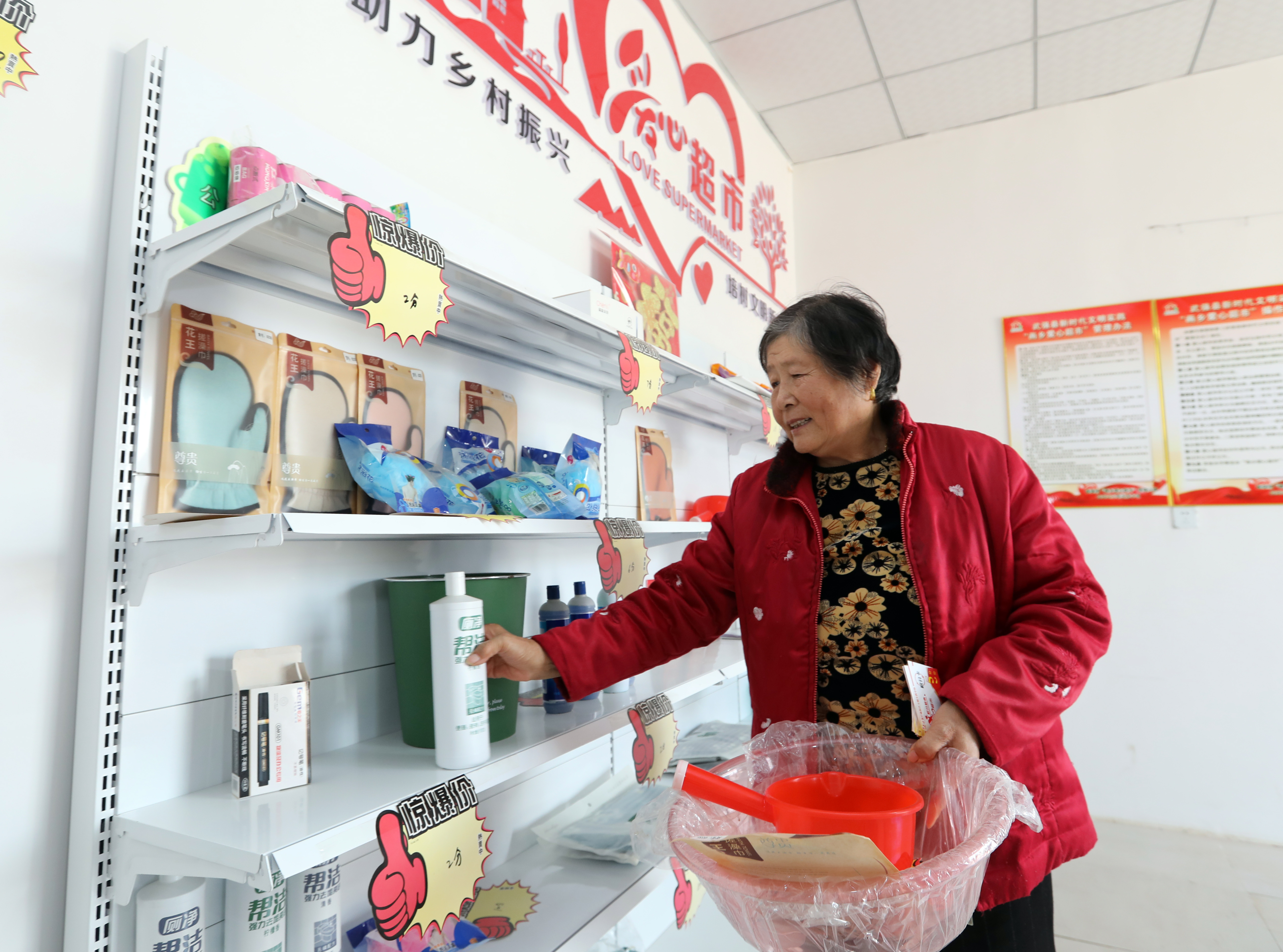 武强县西宋村村民在爱心超市内兑换积分。