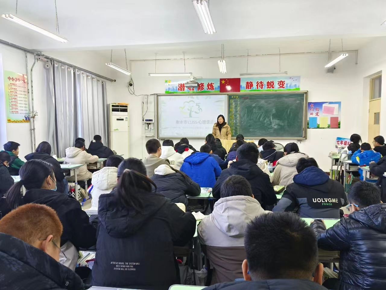 日前,12355心理健康进校园活动走进冀州中学,为冀州中学初中部的学生们带来一堂《期末考前心理调适指南》的心理课。