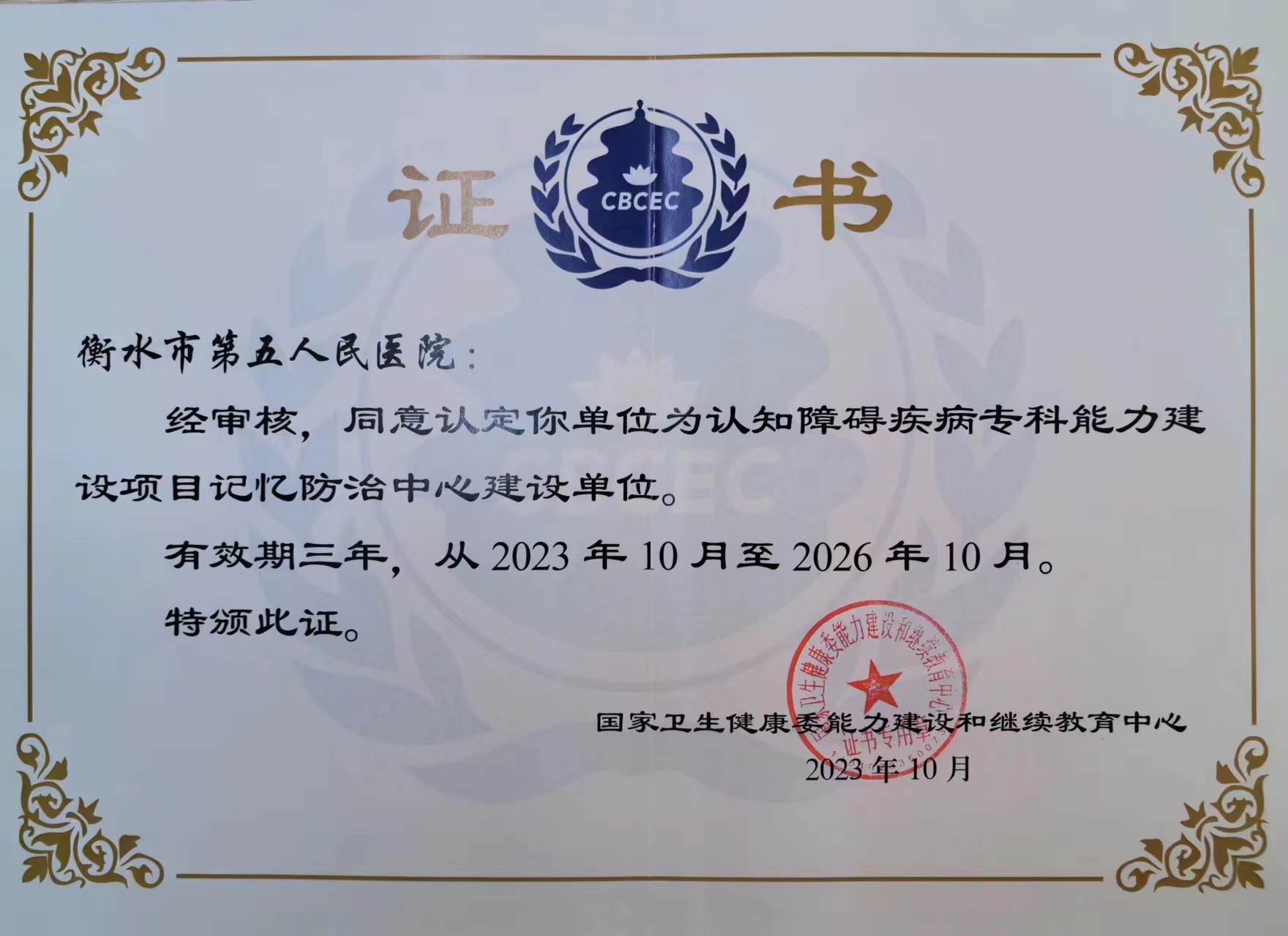 衡水市第五人民医院积极参加国家卫健委的行动,率先在全市进行了记忆障碍防治中心的申请,并通过了验收,成为国家级记忆障碍防治中心。参加国家老年疾病临床研究中心-AD临床前期联盟,是我国阿尔茨海默病(AD)早期诊断研究领域首个国家级的组织,开设记忆门诊(设在神经内五科),列入全国记忆门诊简表。神经内五科派出多人参加了认知障碍科进修学习,参加认知障碍疾病专科能力建设项目-初级认知康复员专项能力培训,初级神经心理测评员专项能力培训,取得合格证书。并且,衡水市第五人民医院神经内五科与北京宣武医院、河北省医科大学第一医院等建立长期合作关系,经常邀专家来院指导工作。衡水五院记忆障碍防治中心目前开展认知障碍多种相关检查测评项目,并且配备多种治疗药物和康复治疗项目。