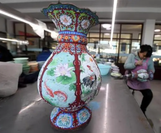 近日,在饶阳县一景泰蓝制作公司展厅内,各式各样的景泰蓝产品琳琅满目。一件景泰蓝产品的制作需要经过设计、制胎、掐丝、点蓝、烧蓝、磨光、镀金七大工序100余道小工序,过程繁琐,细节繁多,十几个工匠要用3个月甚至更长时间才能手工完成。饶阳县在景泰蓝制作过程中不断研发创新,集文化艺术和传统工艺于一身,完美融合了青铜工艺和瓷器工艺,同时引进了传统绘画和雕刻技艺,具有造型优雅、晶莹润泽、精美华贵等特点。饶阳县制作景泰蓝的工艺已有近40年历史,除畅销国内20多个大中城市外,还出口美国、日本等十几个国家和地区,年产值1000万元人民币,深受市场青睐。