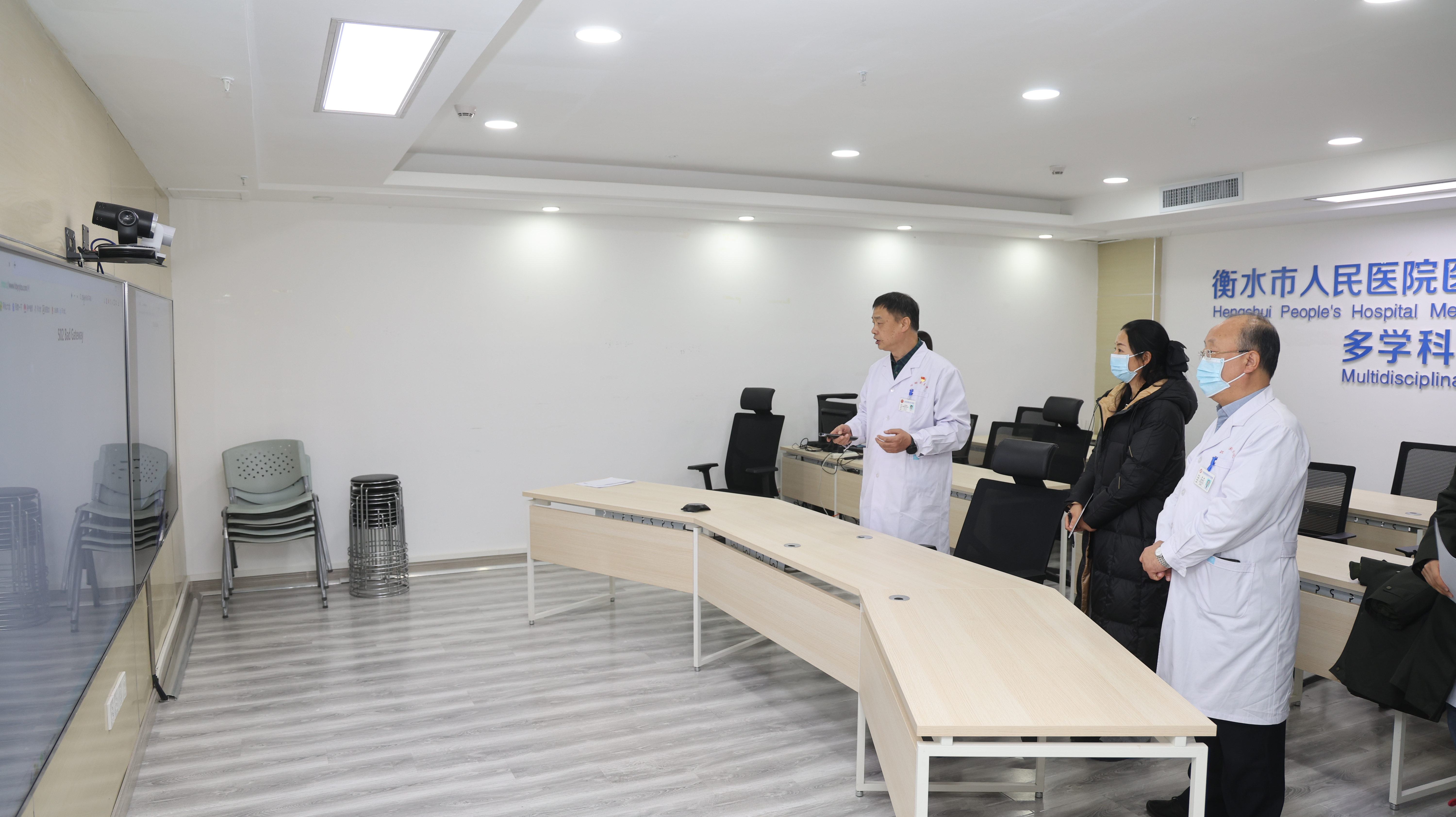 多学科诊疗模式(Multi disciplinary team简称MDT),是现代国际医疗领域广为推崇的领先诊疗模式,是由多学科资深专家组成工作组,针对某一疾病,尤其是某些复杂疾病的诊疗,通过定期会诊、共同讨论形式,提出适合患者的最佳治疗方案,为患者制定个性化诊疗方案的过程,继而由相关学科或多学科联合执行该治疗方案。衡水市人民医院(哈励逊国际和平医院)党委书记郑辉(右一)带领评审专家了解哈院基于互联网医院的线上MDT诊疗模式构建及应用。