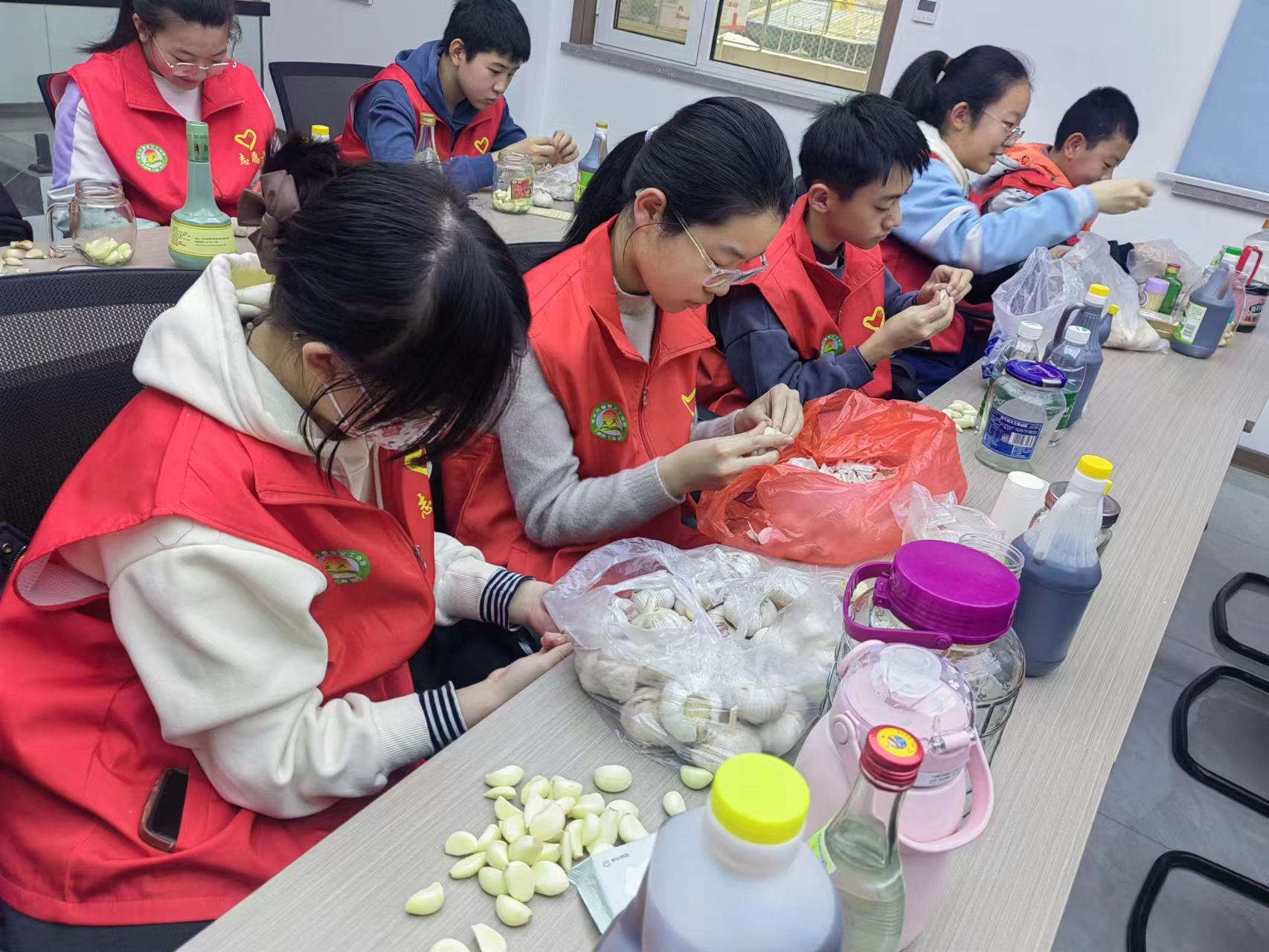 活动中,社区工作人员为孩子们讲述了腊八节的由来和传统习俗,“小孩小孩你别馋,过了腊八就是年……”在一声声朗诵声中,孩子们开始动手制作腊八蒜。社区工作人员将提前准备好的大蒜、米醋、白酒、玻璃瓶放在桌子上,孩子们三两一组,一边剥蒜一边聊天。“要想制作出可口美味的腊八蒜要掌握好醋和蒜的比例,并且一定要密封严实。”社区工作人员说。不一会儿,所有的蒜分装完成,孩子们将醋倒进瓶子中,再盖好盖子,一瓶瓶腊八蒜就制作完成了。不少孩子是第一次制作腊八蒜,他们纷纷表示,十分新奇好玩,还学到了不少知识,等腊八蒜腌制成功后要让全家人尝一尝。