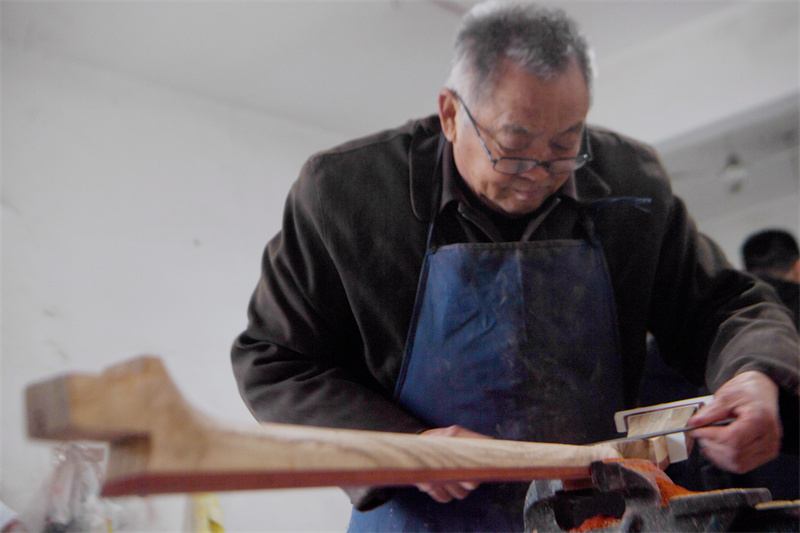手工艺人对乐器进行打磨。崔佳栋 摄