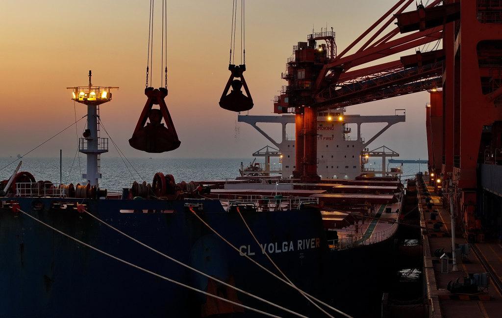 2023年10月27日,一艘轮船靠泊在唐山港曹妃甸港区矿石码头卸载(无人机照片)。新华社发
