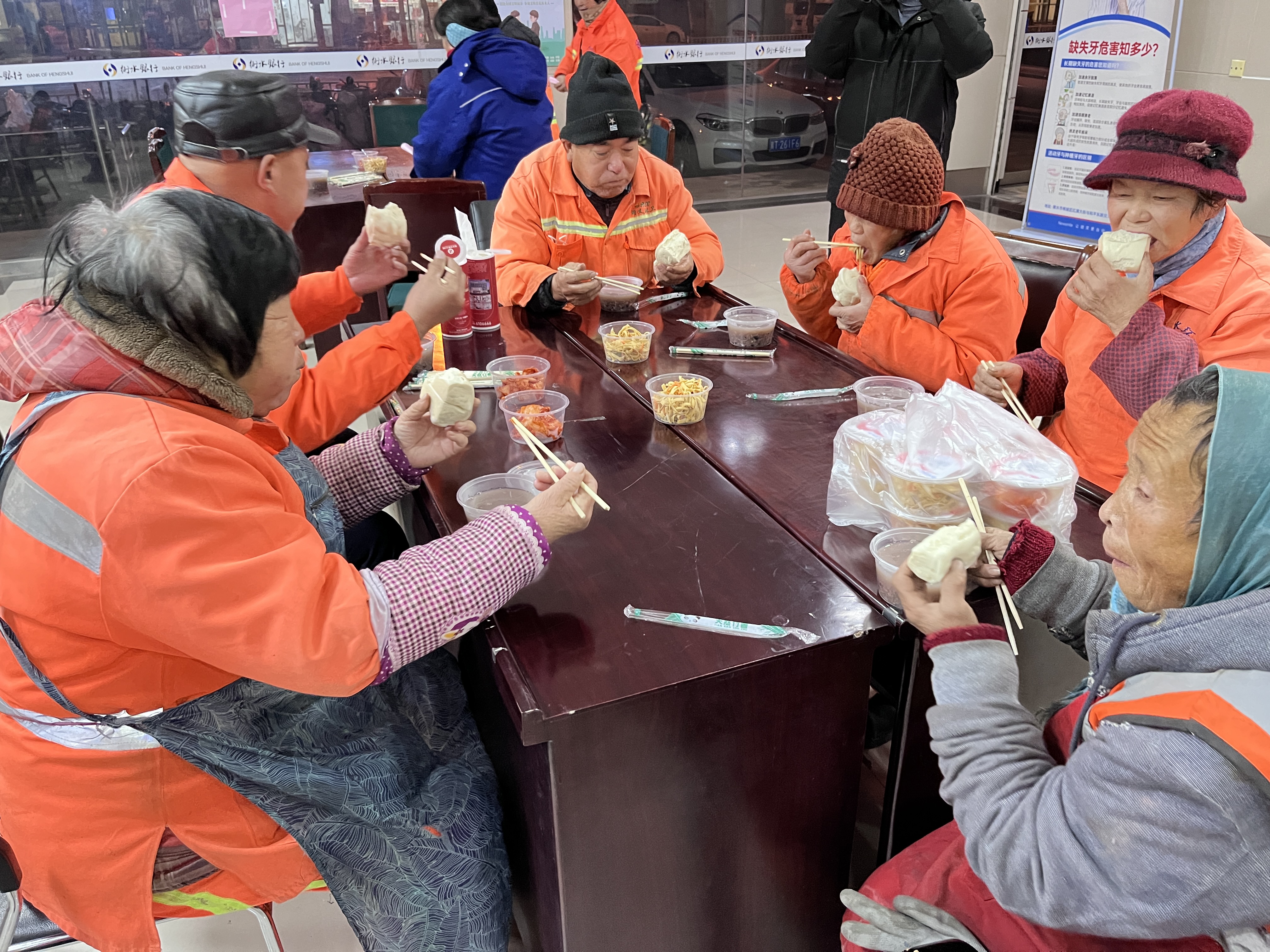清晨7时许,衡水银行荣华支行(旧址)大厅内人头攒动,经过两个多小时精心熬煮,香喷喷的腊八粥终于出锅了,热气腾腾的腊八粥散发出阵阵香甜味,让人垂涎。“辛苦您了!来,喝碗腊八粥,热乎的!”“您还喝吗?再来盛啊。”志愿者把腊八粥递到环卫工人手中,环卫工人石志敏笑呵呵地感慨道:“摸着黑儿就出来了,这两天还下雪就更冷了,俺们喝了腊八粥,身上马上就暖和和的了。”