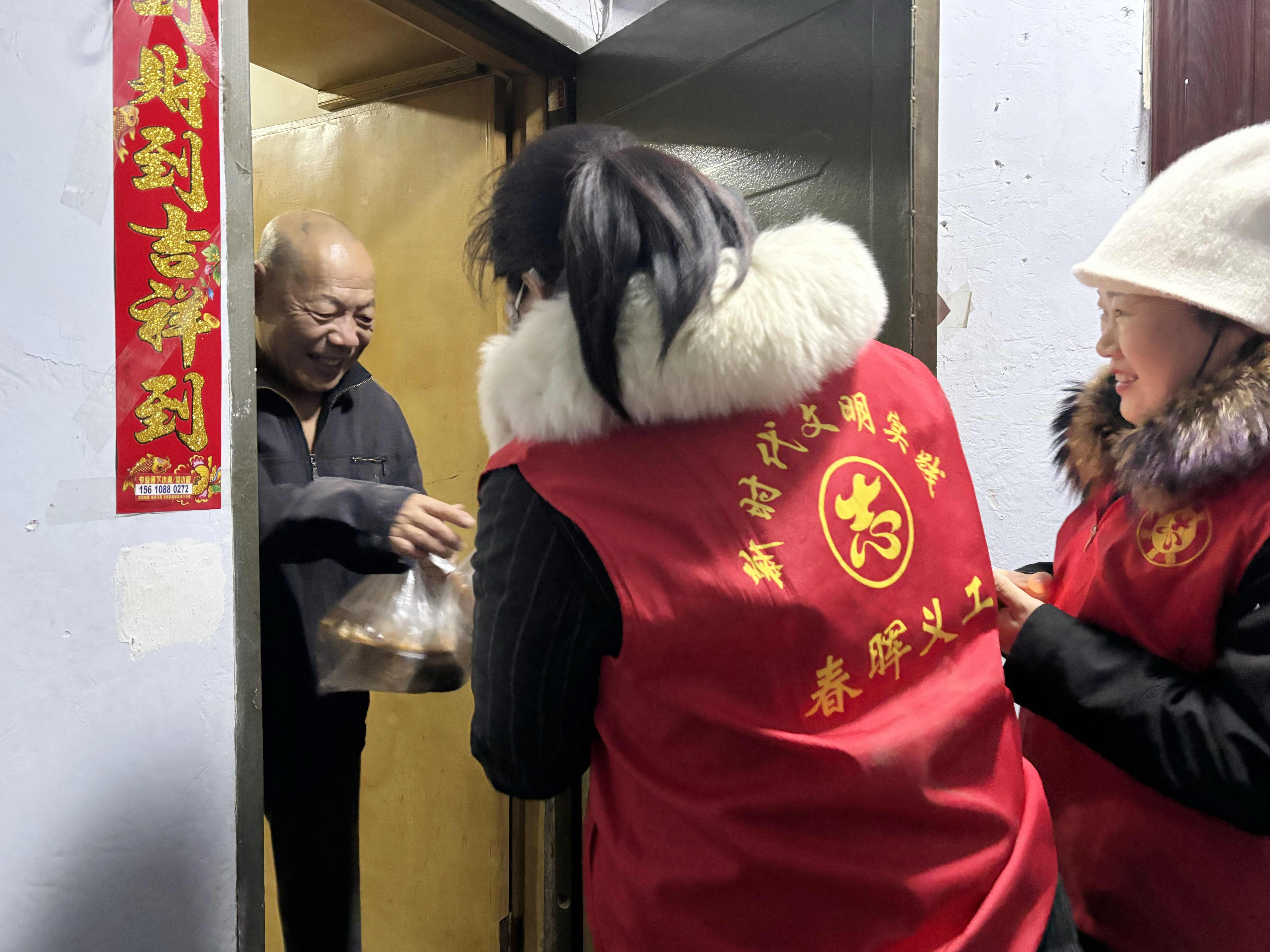 在衡水铁路第一生活区,春晖义工协会志愿者上门为独居、高龄且行动不便的老人送上“爱心粥”,让老人们在寒冷的冬天感受温馨的节日氛围。
