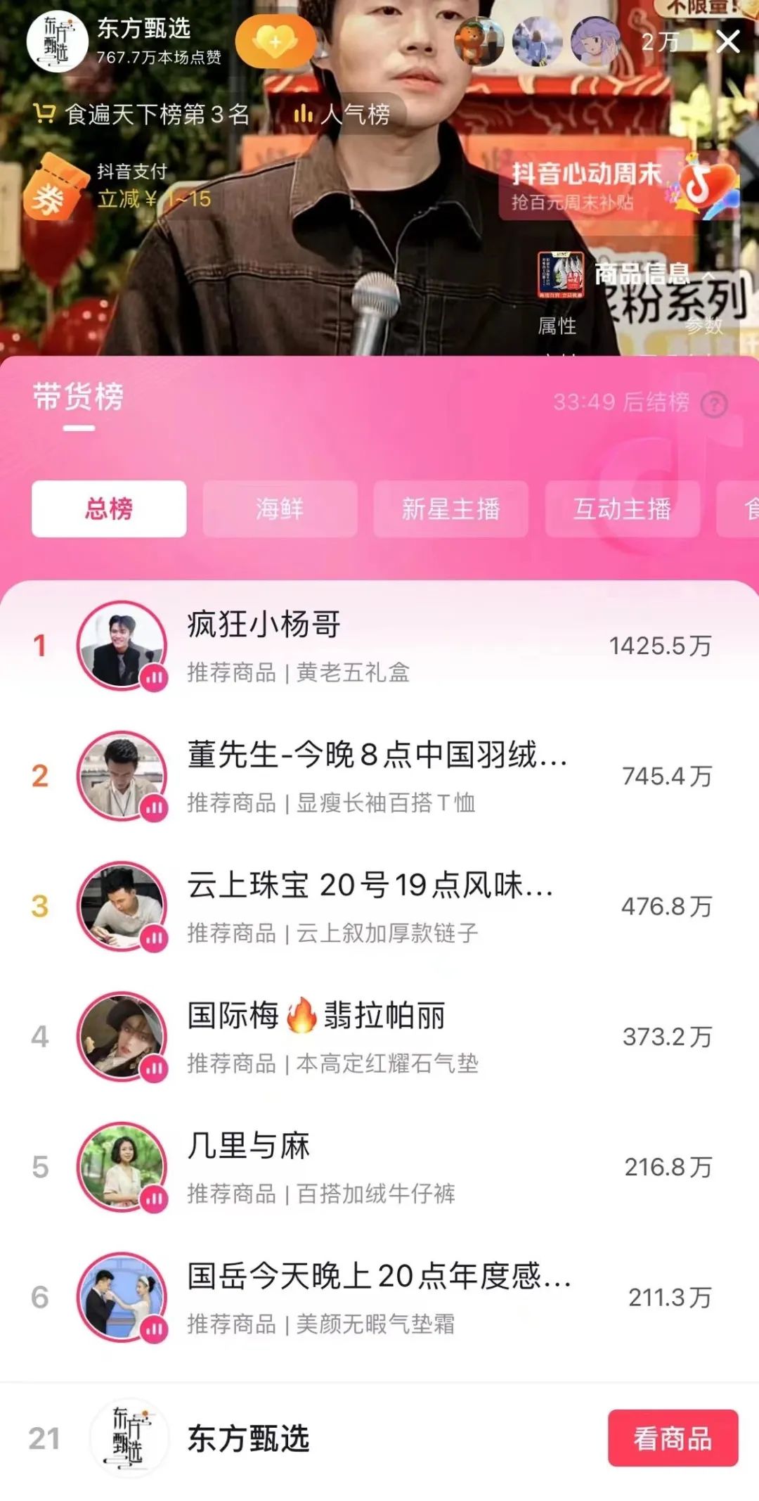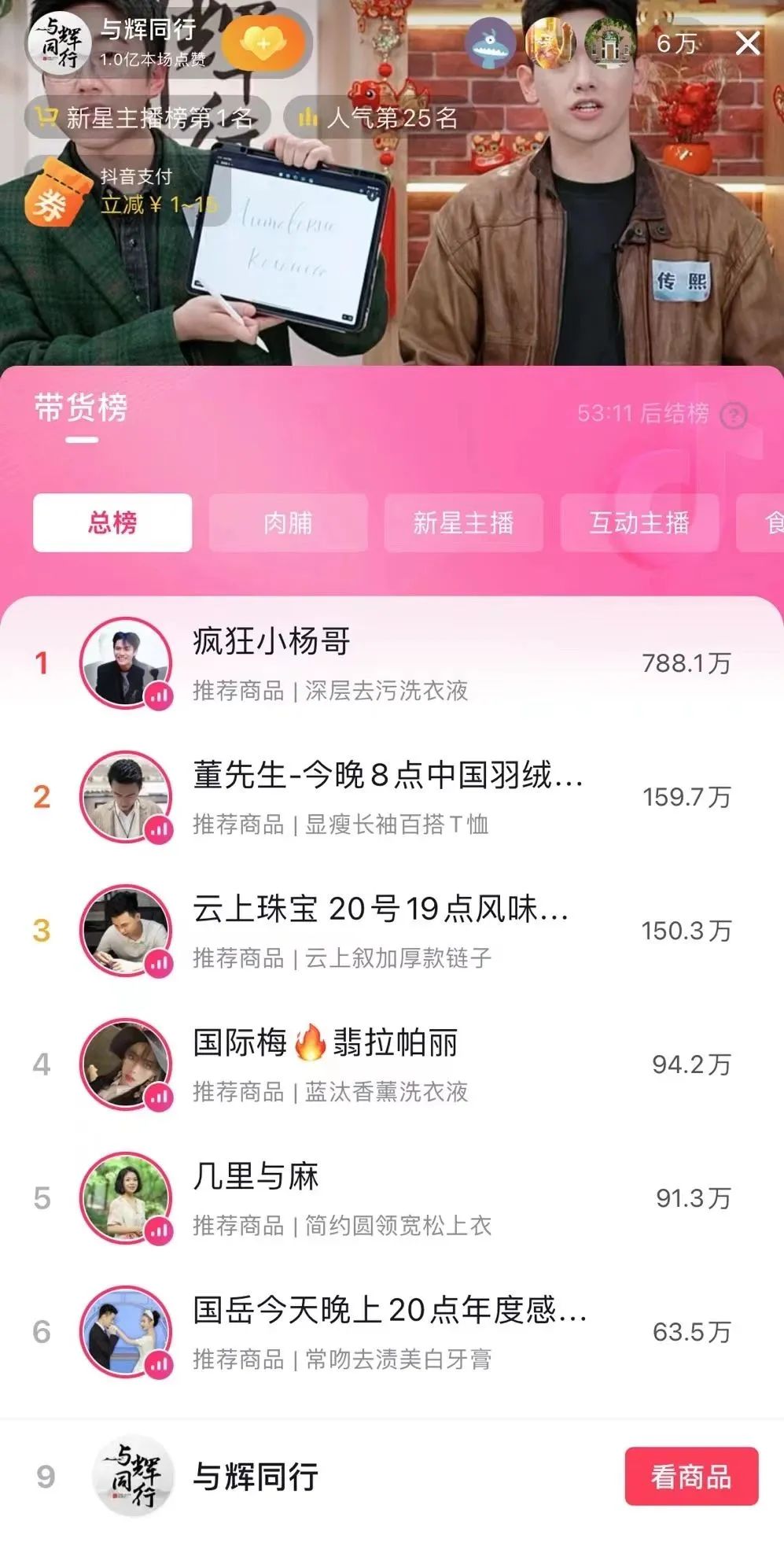 截至20日23时,东方甄选抖音粉丝数为3123.6万,与辉同行抖音粉丝数为1298.6万。“与辉同行”抖音直播间位列带货总榜第9名,同在直播的“东方甄选”则位列带货总榜第21名,居于“与辉同行”之后。