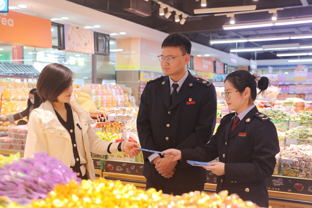 向商户发放宣传资料。常晓晴 摄