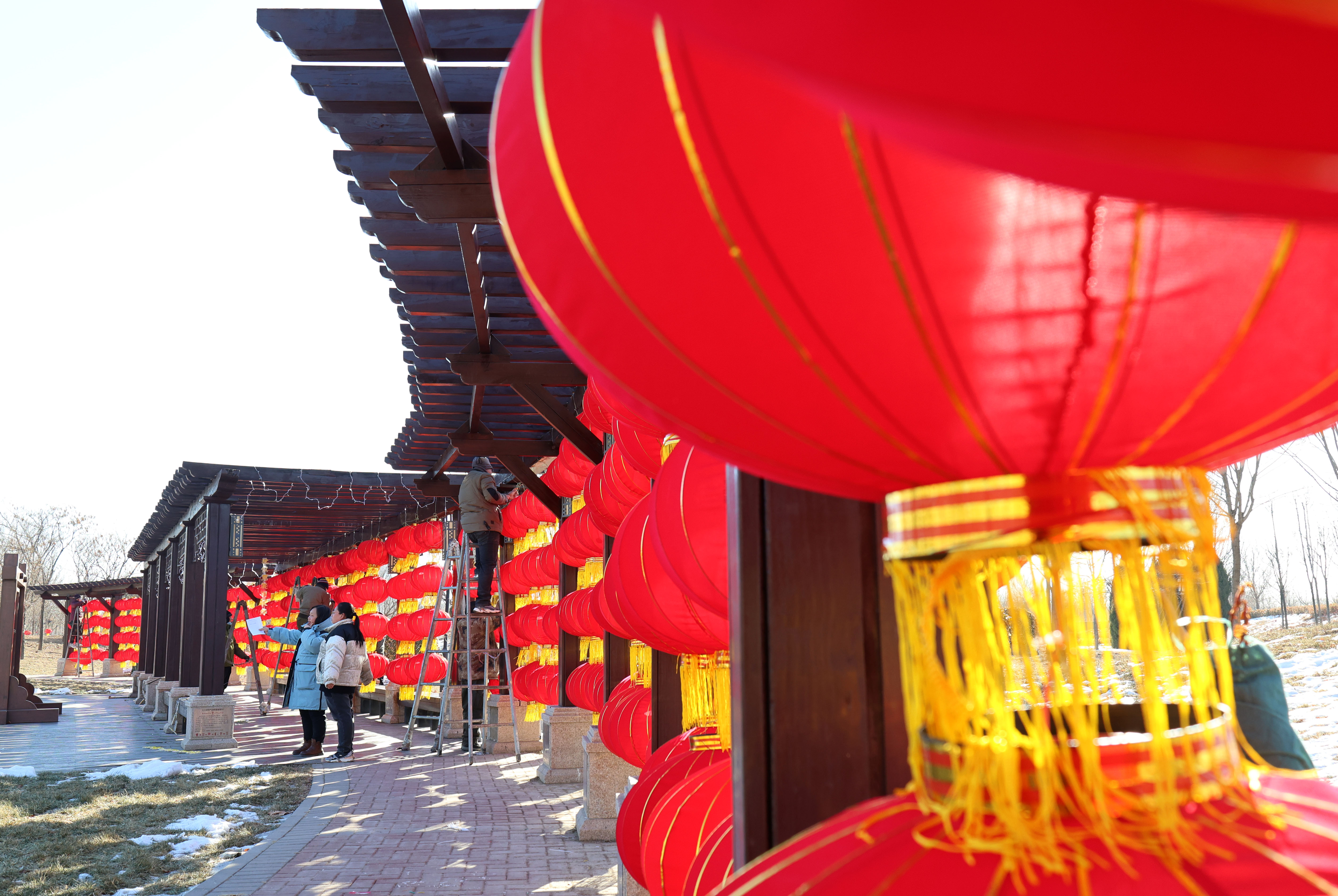 记者来到公园风雅文化园区,远远看到工人们冒着严寒,正在进行灯笼的安装和调试。在古诗词长廊区,长廊一侧已经挂满红彤彤的灯笼,中间搭配着亮化古诗词。待夜幕降临,灯火阑珊,树木为骨,诗词为魂,百余组诗词灯笼如荧荧流星,袅娜悬于空中,在唯美的氛围中感受传统文化的魅力。该灯组高4米,长45米,目前已经完成80%的安装进度。