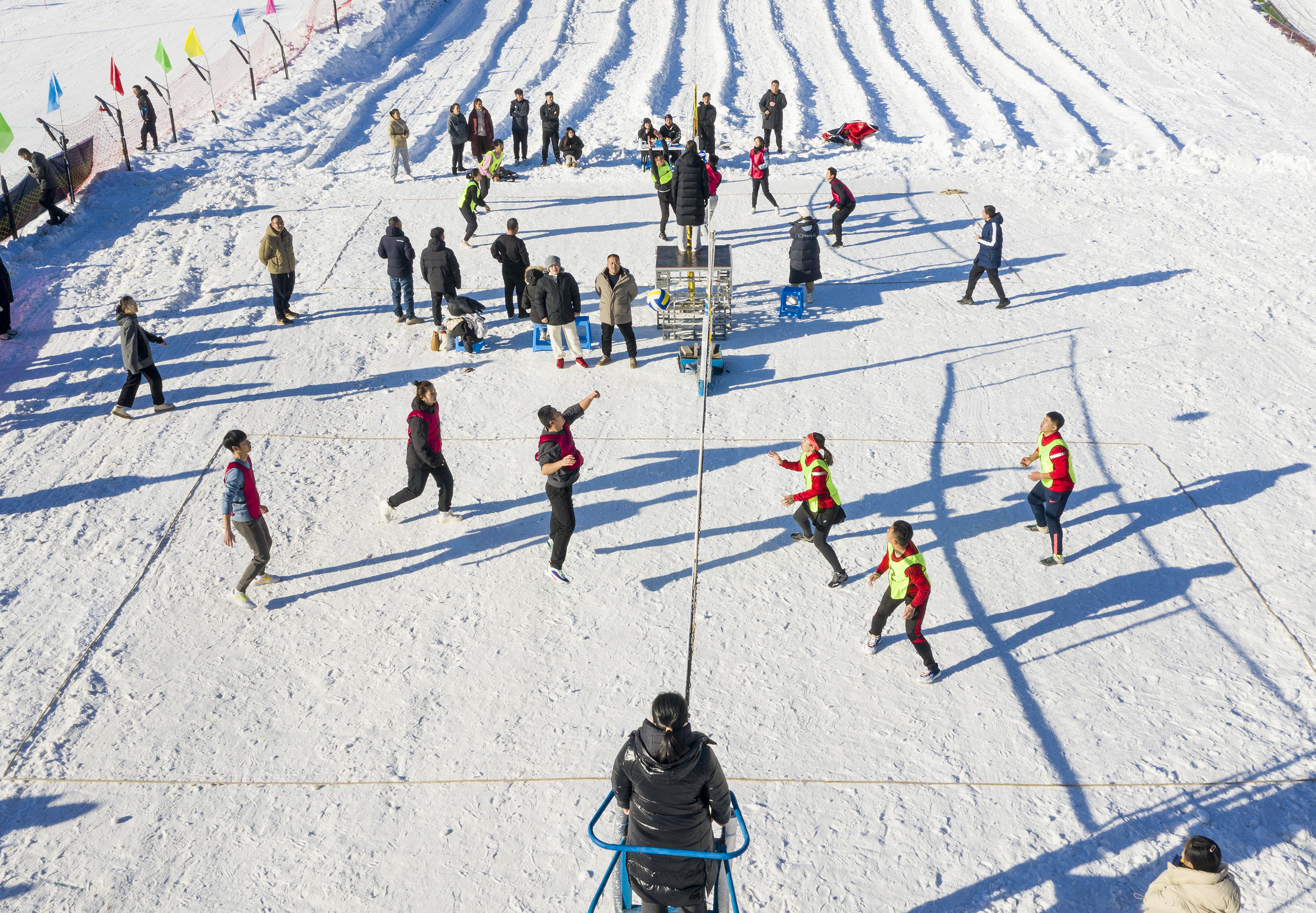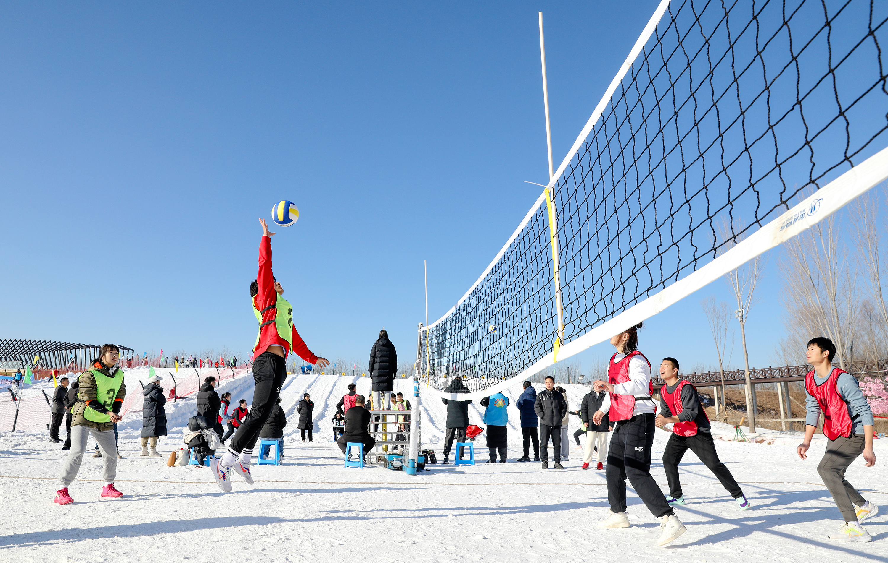 启幕现场,来自各县市区的100余名运动员、爱好者参加了雪地排球和双板滑雪比赛。参赛选手团结协作、奋力拼搏,尽情享受和展示着冰雪运动带来的乐趣与激情。