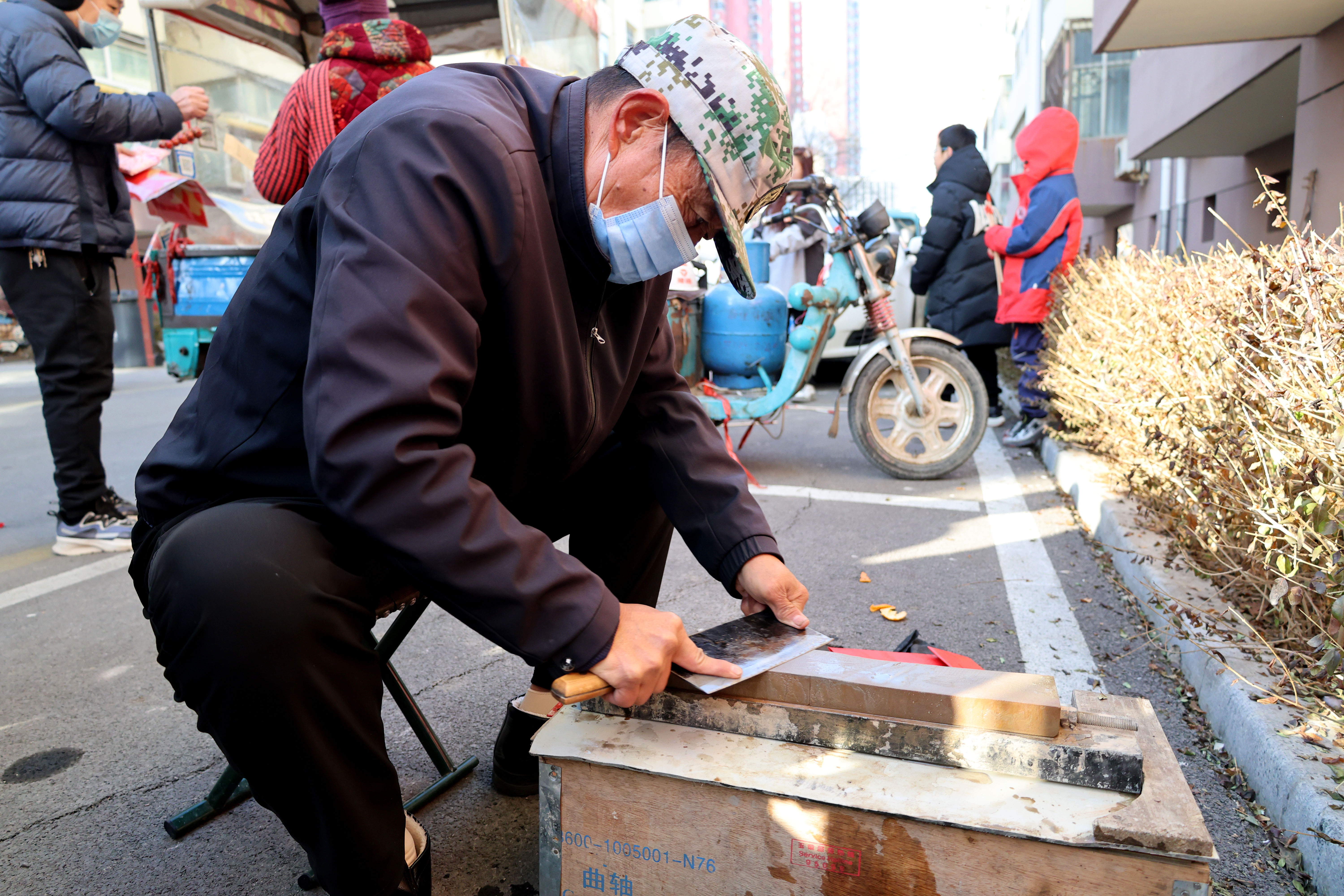 当天上午9时30分,邀请的磨刀师傅开始在给社区居民们磨菜刀。刀身与磨刀石之间发出的霍霍声,很自然让人联想到“磨刀霍霍向猪羊”的场景,也从内心深处涌起对新春佳节即将来临的喜悦感。