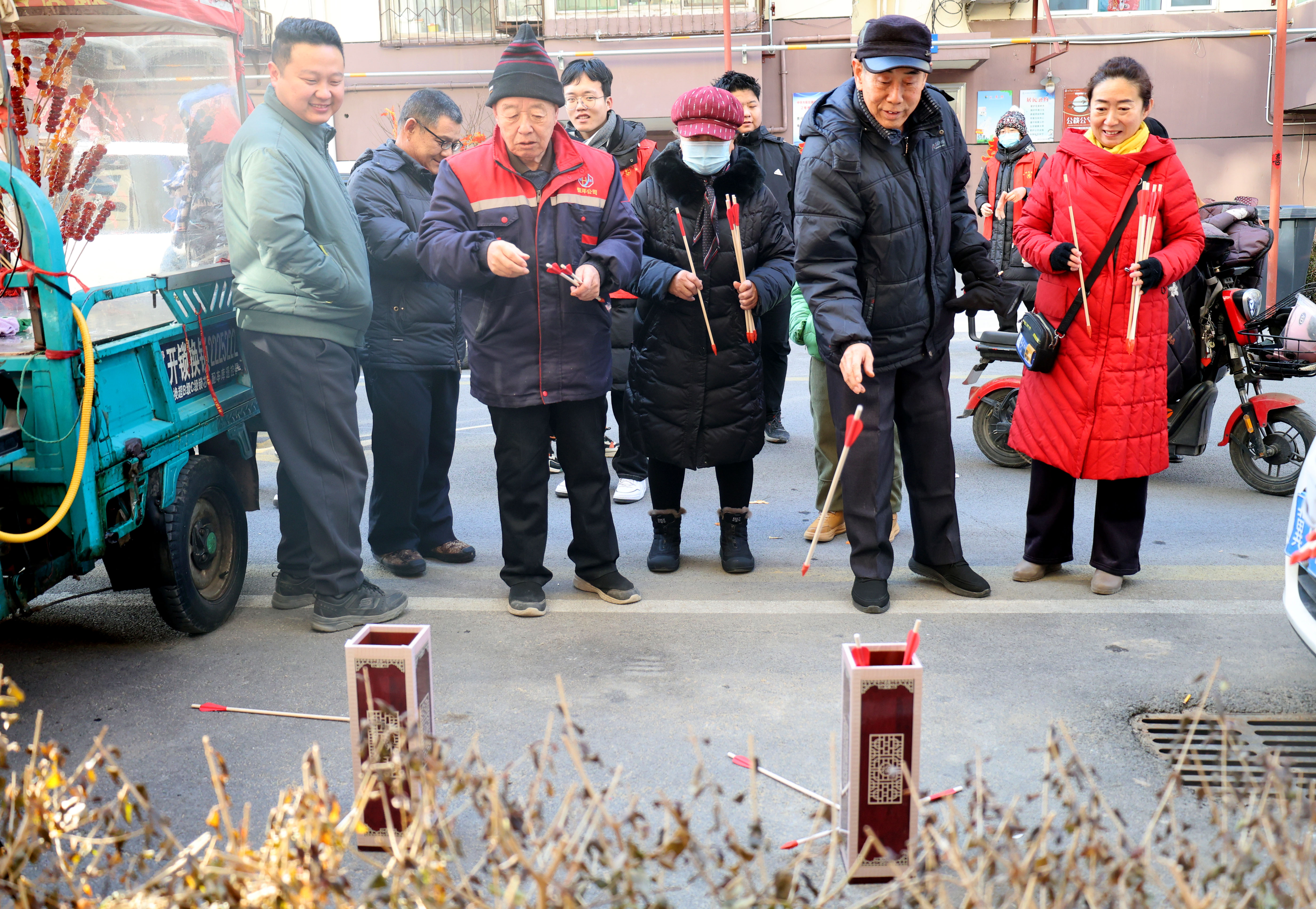 现场最热闹的还有投壶场地。听完老师向大家介绍的投壶的起源、玩法﹑规则后,大家都对投壶表现出了极大的兴趣,迫不及待地排起队,准备一展身手。每位居民有5支箭,投中5支箭可免2个月物业费,投中4支箭免一个月物业费,投中3支箭奖励又红又甜的糖葫芦一串。一轮游戏体验下来,糖葫芦的摊位被大朋友小朋友包围。居民们各个意犹未尽,喜悦之情溢于言表。