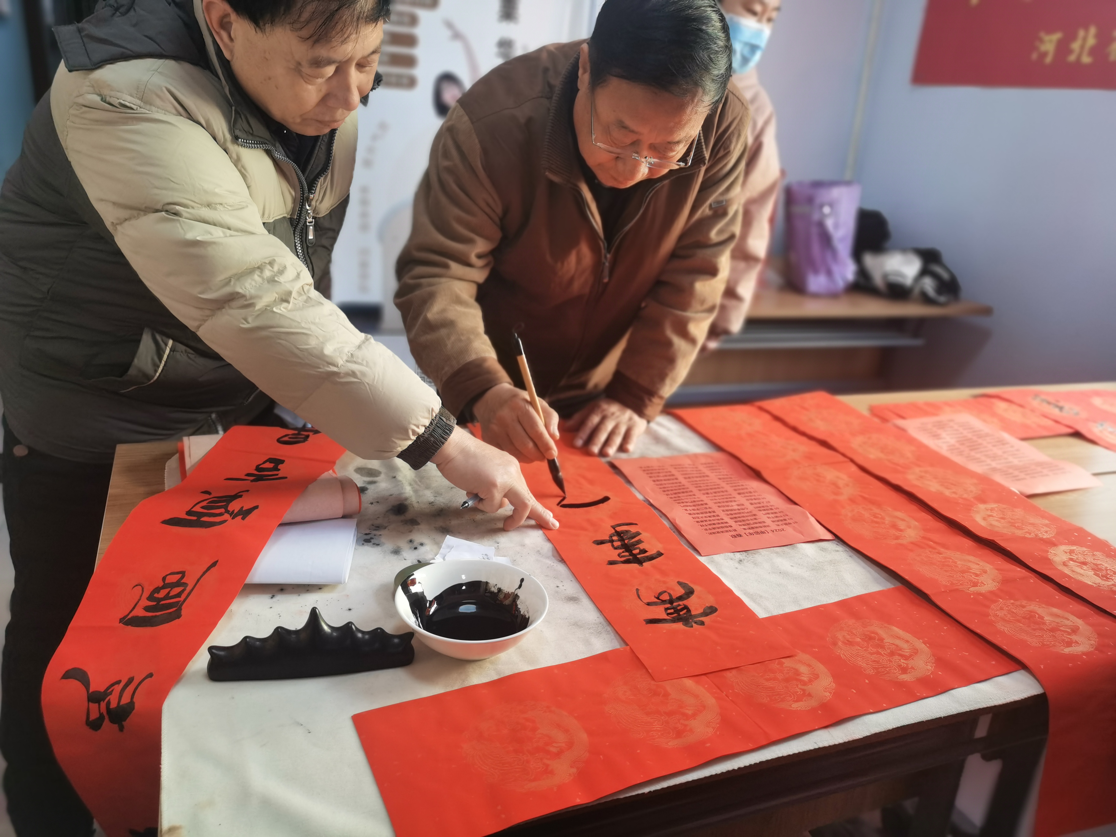 活动邀请了衡水毛体书法家协会的陈九如老师和王乃浩老师为社区居民免费写春联。“老师请帮我写一张‘瑞气满门吉祥宅,春风及第如意家’,横批‘福禧临门’。”“老师我想要一张‘福星高照全家福,春光耀辉满堂春’,横批‘春意盎然。’”……大家都迫不及待地将自己心仪的对联句子告诉两位老师。红纸铺开,两位老师手持毛笔蘸饱墨汁,认真地为居民书写,一笔一划间倾注了他们的感情和祝福。