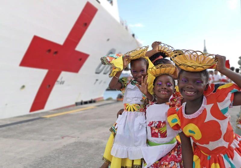 △2018年10月,在安提瓜和巴布达首都圣约翰,当地小朋友身穿传统服装欢迎中国海军“和平方舟”医院船首次到访。