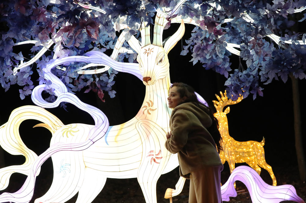 2023年12月14日,一名女子在法国巴黎风情园举办的“山海有灵”法国豫园灯会上拍照留念。