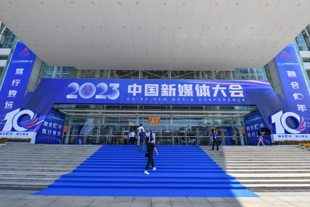 这是2023年7月12日拍摄的2023中国新媒体大会中国新媒体技术展外景。新华社记者 陈泽国 摄