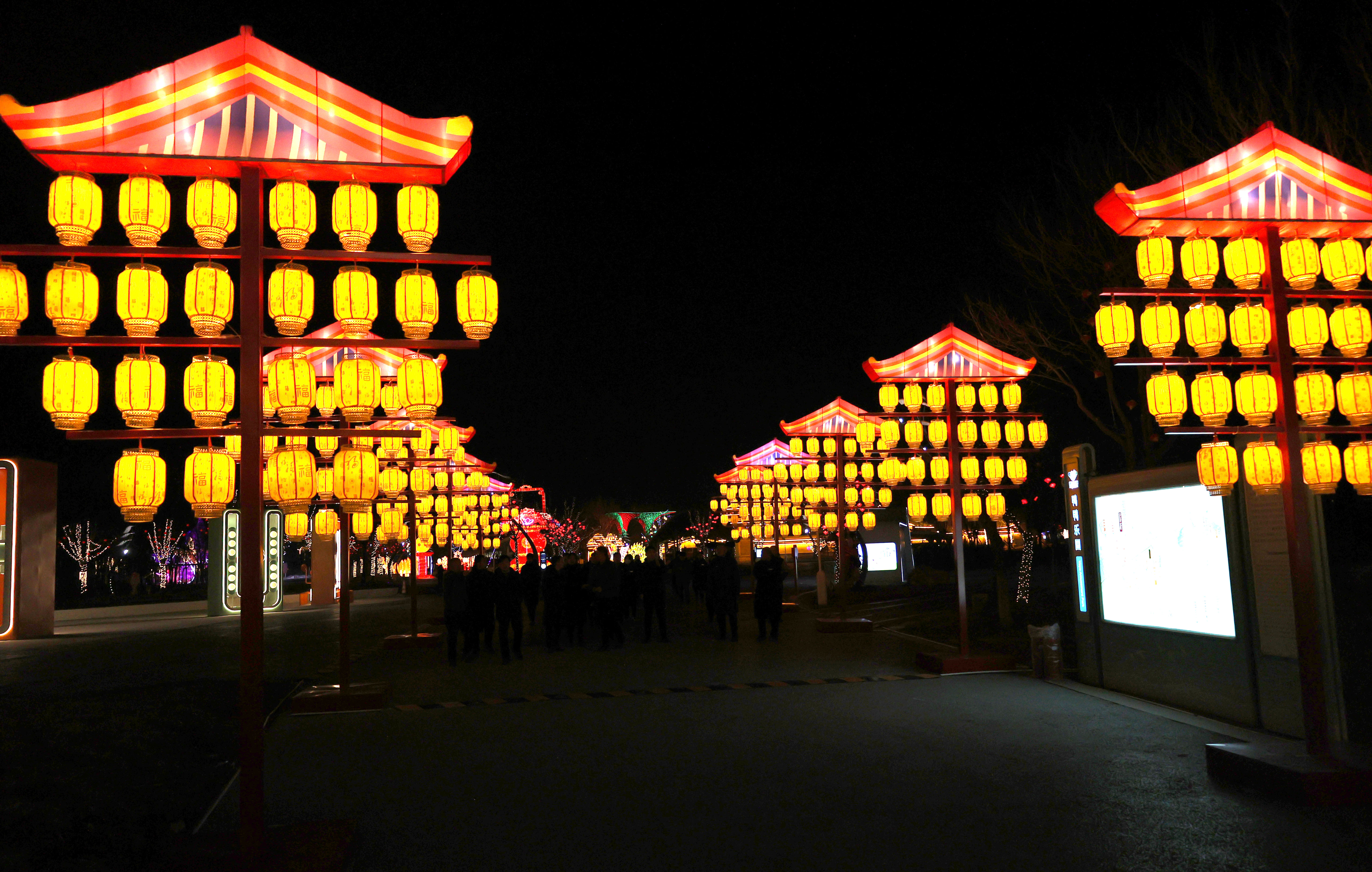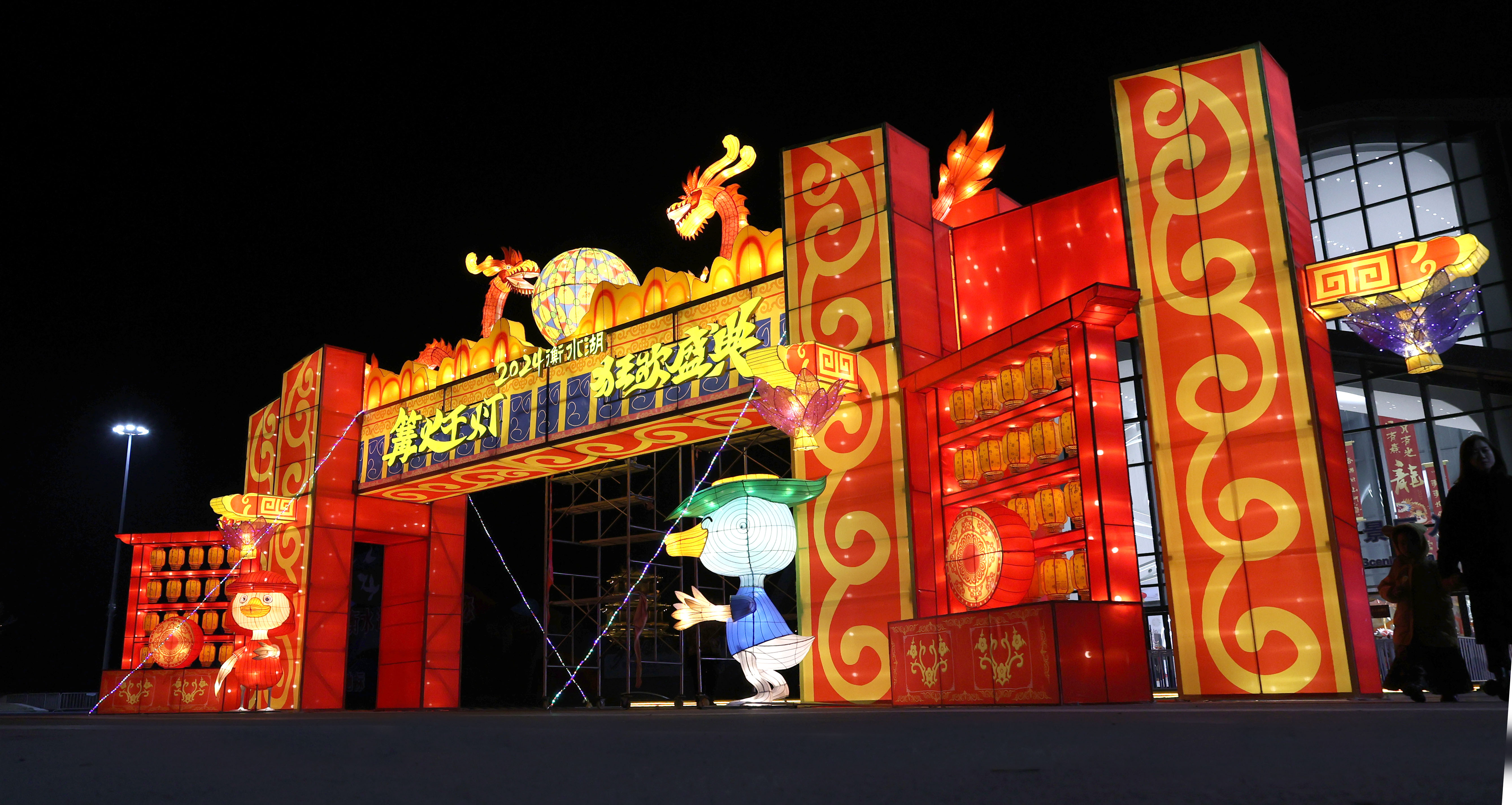 在衡水湖旅游景区·鸭鸭乐园北门外,首先映入眼帘的是长22米,高8米的龙年迎春门。两个神龙造型精美,体态矫健,似奔腾在云雾波涛之中,再加上祥云、灯笼等传统元素,喜庆的节日氛围格外浓郁。随后,记者走进鸭鸭乐园,路边两侧的黄色宫灯颜色鲜艳、排列有序,将整条道路照亮。远处大花篮造型的花灯格外漂亮,吸引眼球,寓意着新的一年人们生活富足美好。