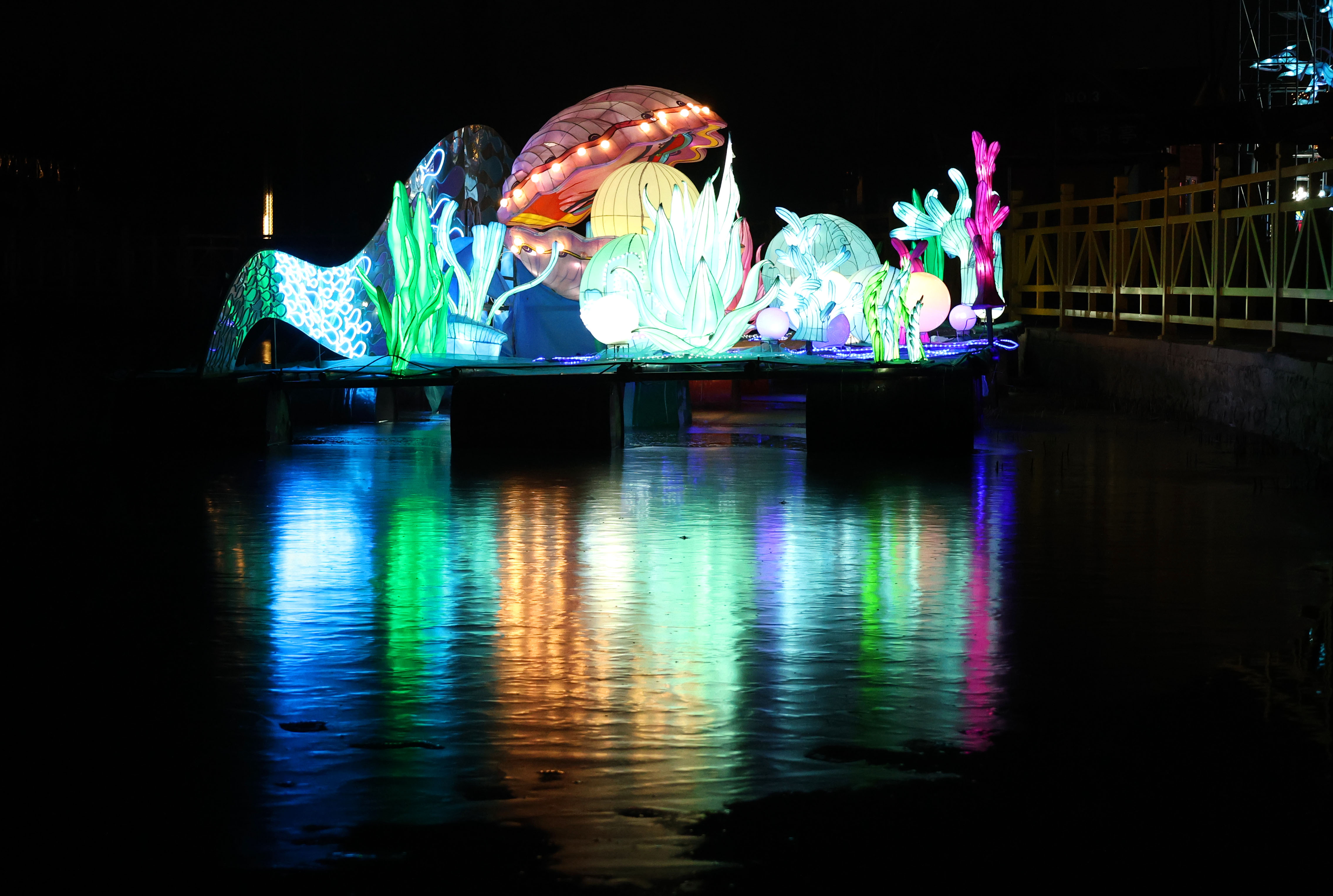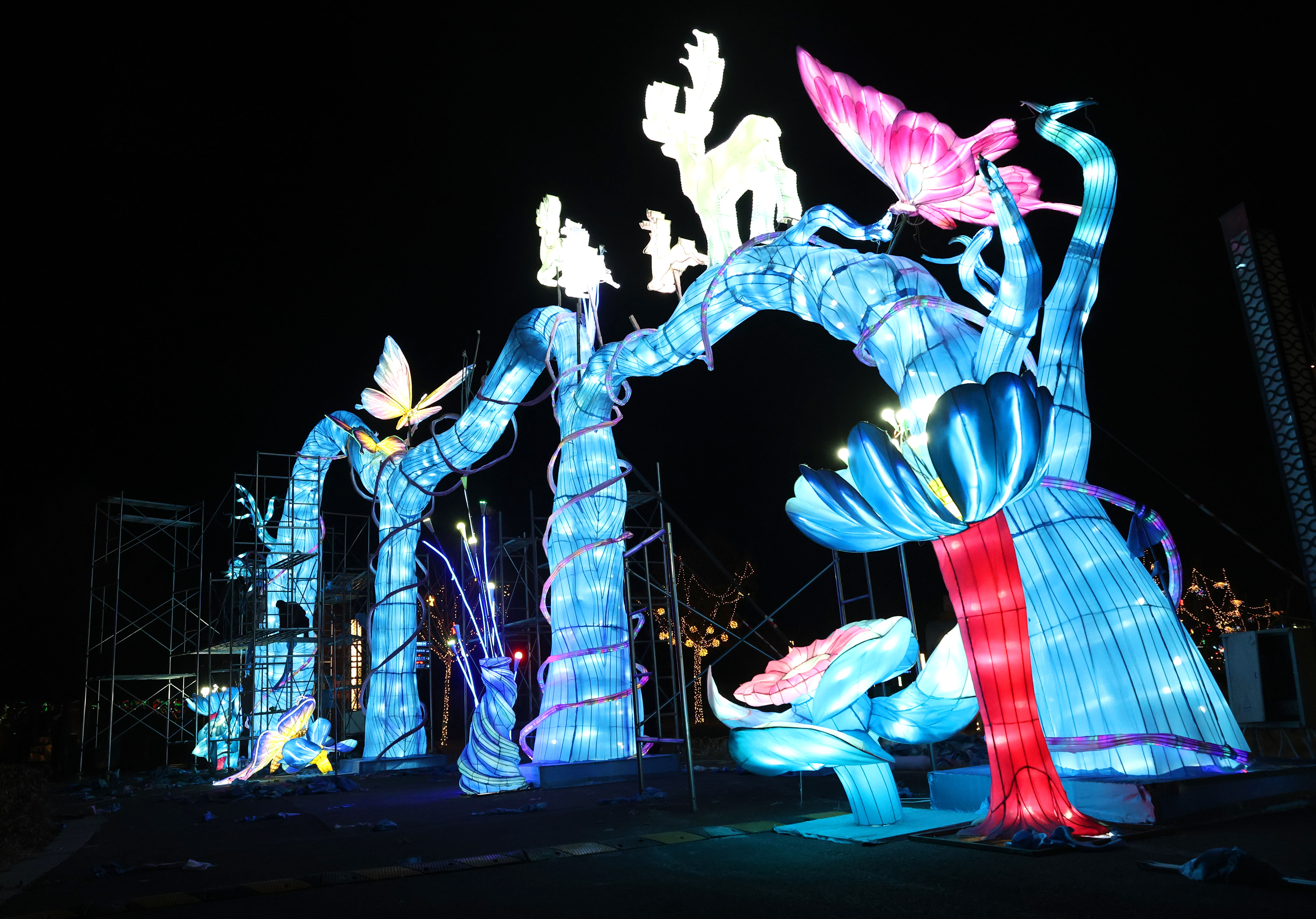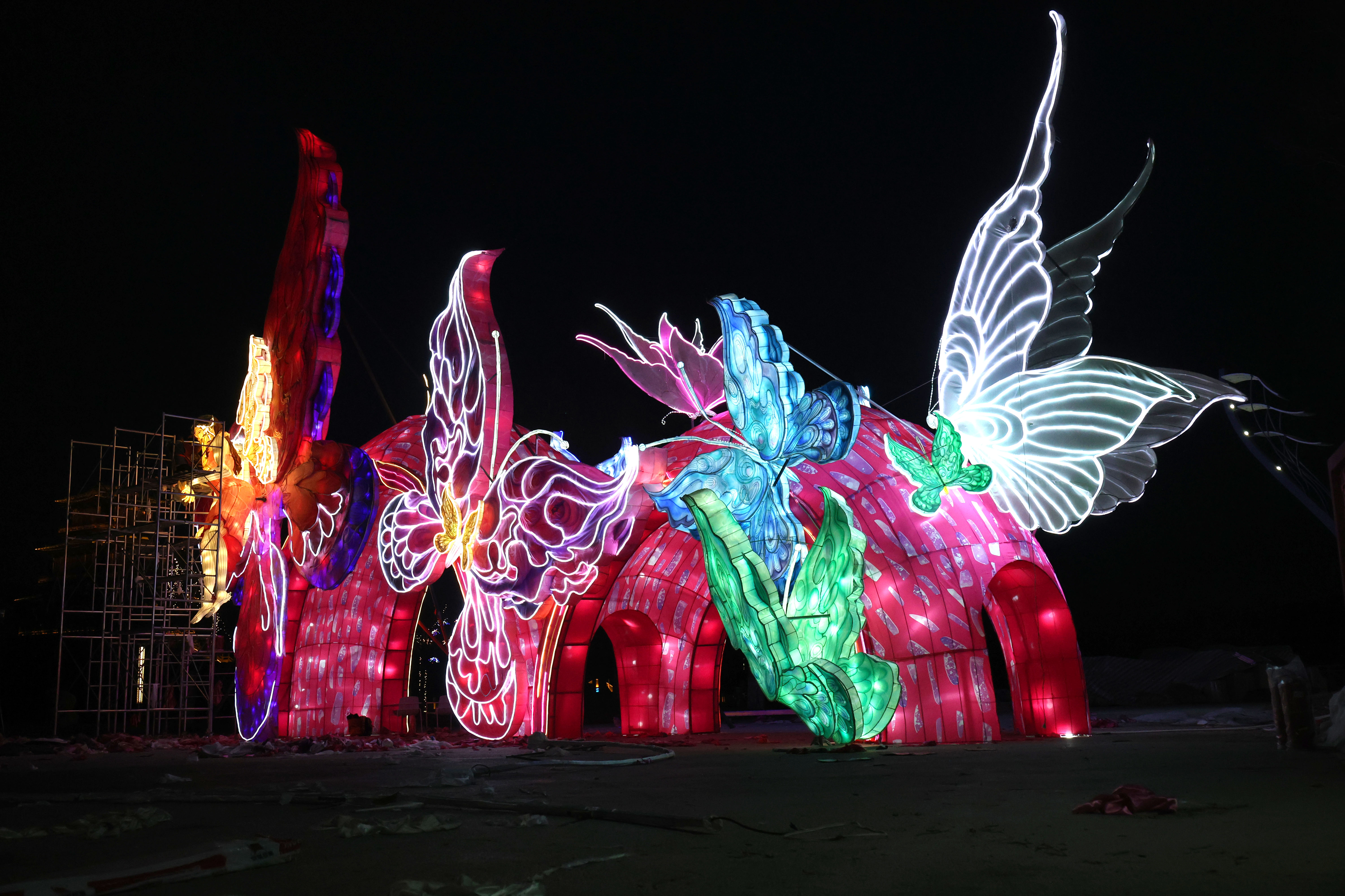 在滏阳湖西侧水中是一个奇幻水域灯彩组合,夜色下的大型贝壳灯不断改变着色彩一开一合,在周围水草、数十条小鱼的映衬下格外迷人。 滏阳湖前空地是一个即将完成的长25米、宽5米、高12米富有梦幻色彩的鹏游蝶梦大型灯彩组合。工人们分工明确、配合默契,正在安装灯体,现场呈现出一派热火朝天的繁忙景象。此外,园内还有蝴蝶之灵、华灯初上、龙凤呈祥、天空之城、奇幻幽径等多种主题多种造型的灯组。