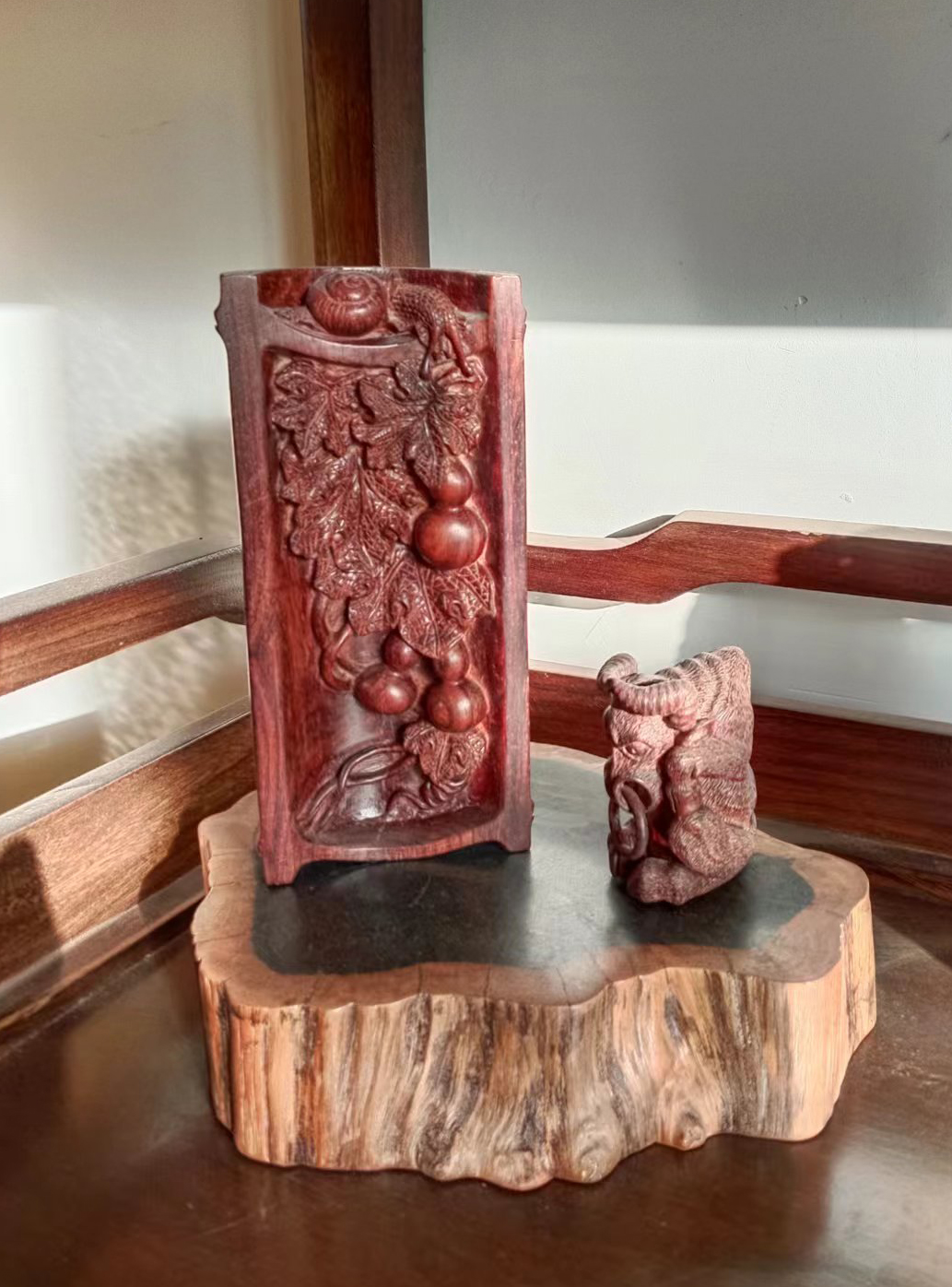 小叶紫檀木雕葫芦竹节臂搁。