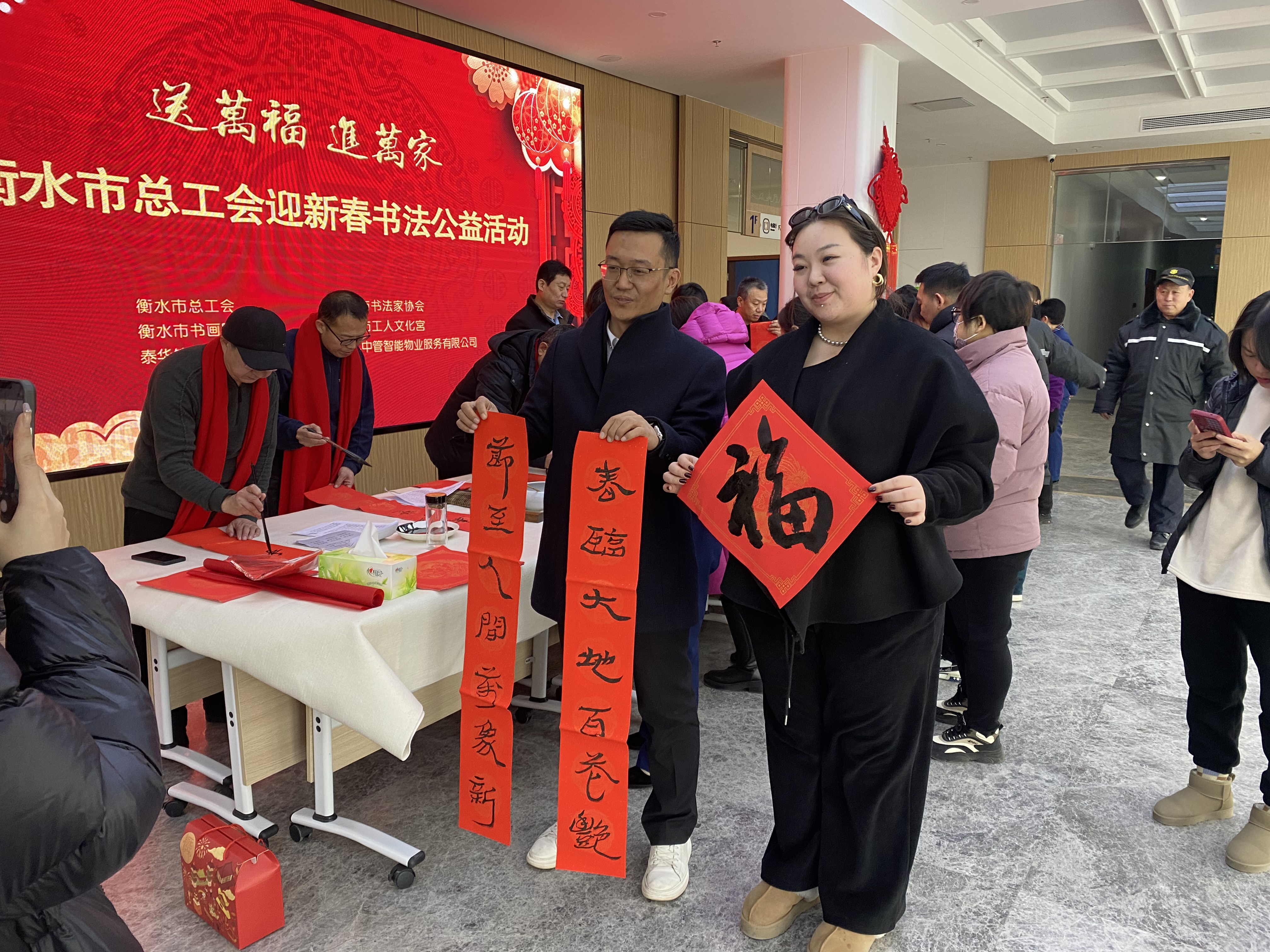为了惠及更多群众,把悦目暖心的祝福送到千家万户,市总工会特意安排上午和下午两场活动,分别在宝云街泰华锦业生活服务公司和衡水市工人文化宫举办。活动现场,书法家们饱含创作热情挥毫泼墨,一个个饱满隽永的“福”字墨迹未干,便在大家手中传递开来;一幅幅吉祥如意的春联墨香飘逸,映着职工群众欣喜的笑脸。