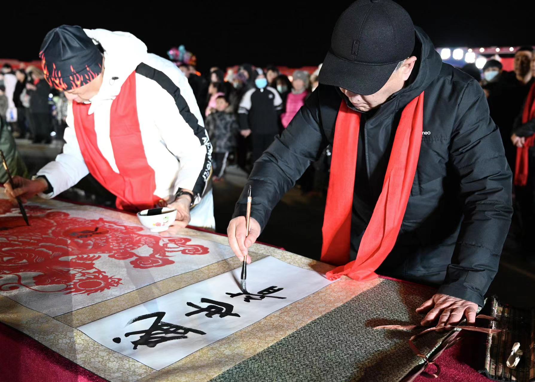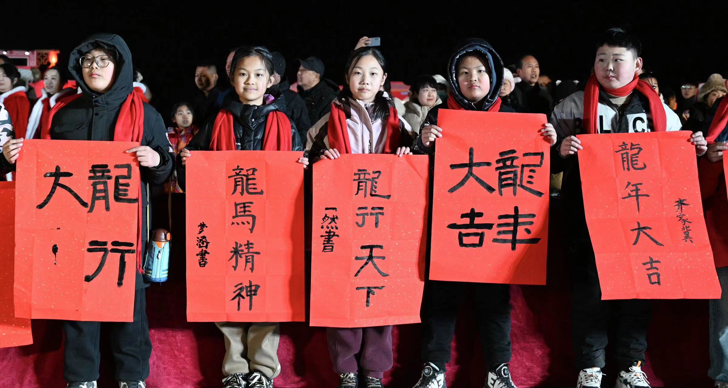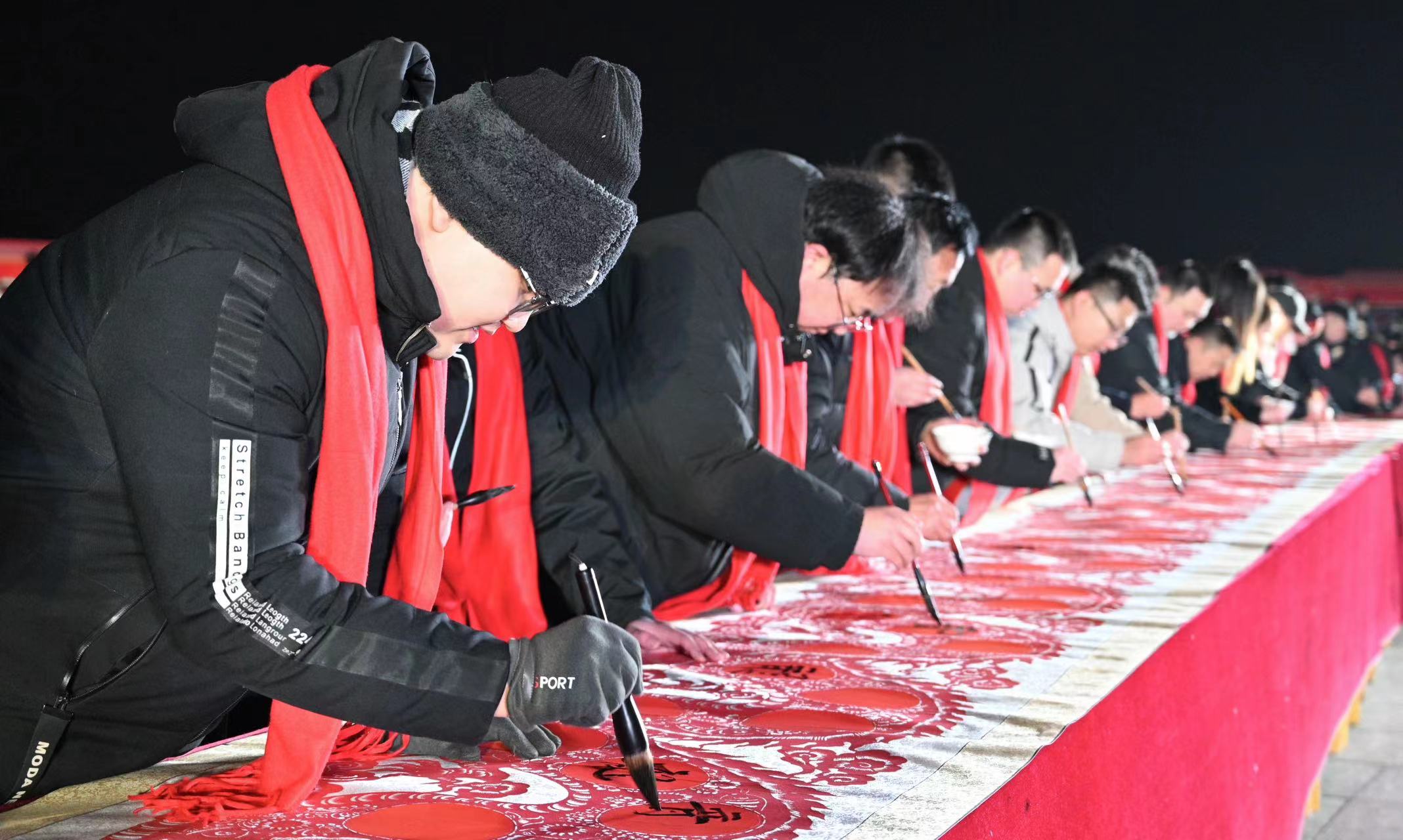开幕式上,百名冀州书画爱好者齐聚于此,一同在长达18米的祥龙剪纸上书写“龙”字,不多时,风格迥异的“龙”字便跃然纸上,或遒劲有力、或潇洒飘逸、或隽永俊秀;“书画小能手”们用稚嫩的双手写下带有“龙”的成语,“龙腾盛世”“龙马精神”“金龙献瑞”……字里行间饱含着对祖国的赞颂和祝福,笔墨锋毫中满是对新年的美好祈愿。壮观的景象和书画爱好者们精湛的技艺,引得围观群众不时竖起大拇指点赞。