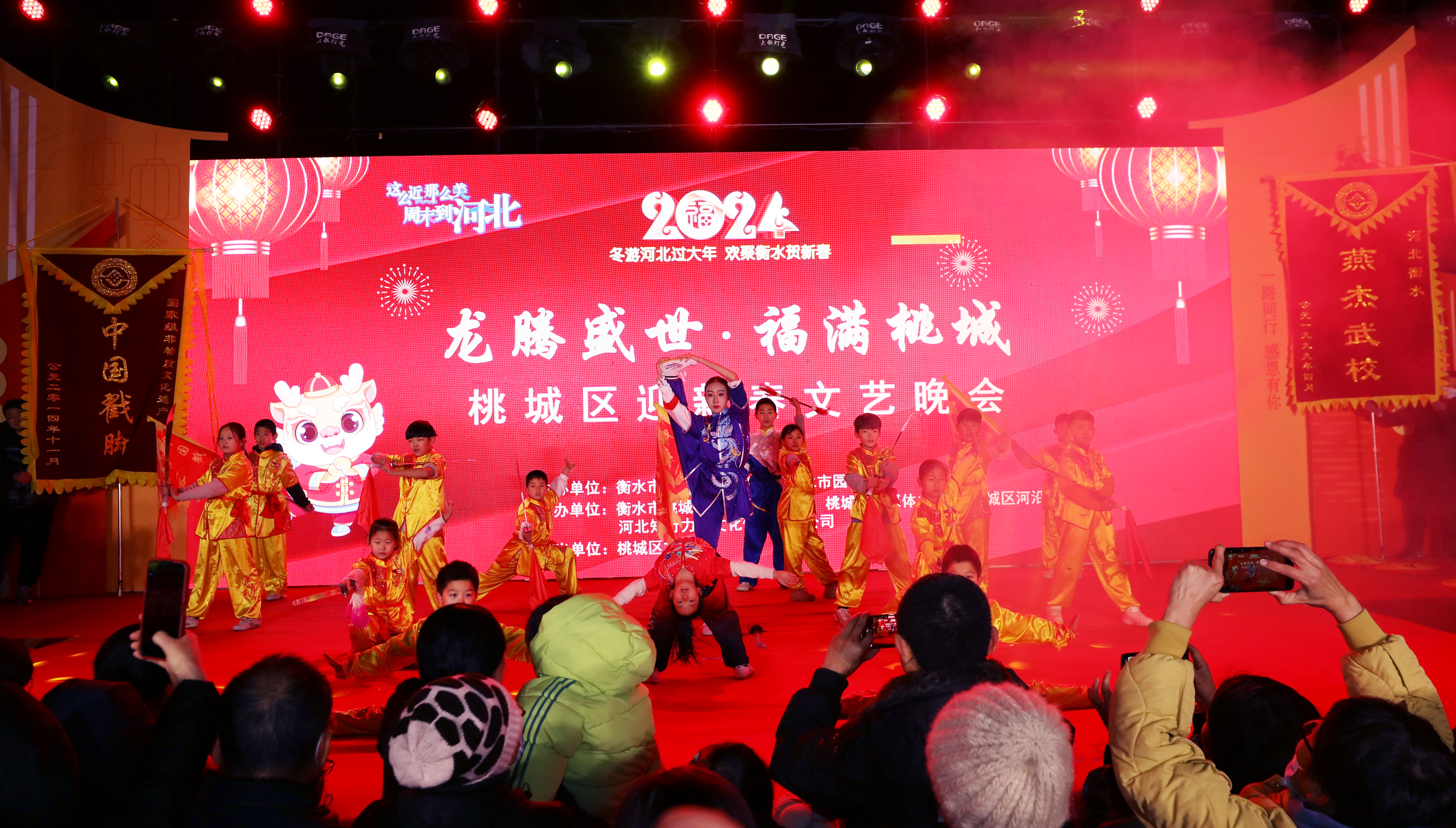 灯会现场,由桃城区政府、市园林中心主办,桃城区文旅局、桃城区融媒体中心、河沿镇政府、河北知行力量文化传播有限公司承办的“龙腾盛世·福满桃城”桃城区迎新春文艺晚会也在这里隆重举行。开场鼓《鼓韵桃城》、舞蹈《张灯结彩过大年》、京剧《红灯记》选段灯等精彩节目轮番演出,尤其是衡水非遗戳脚的表演,让现场观众掌声不断、连连称绝。