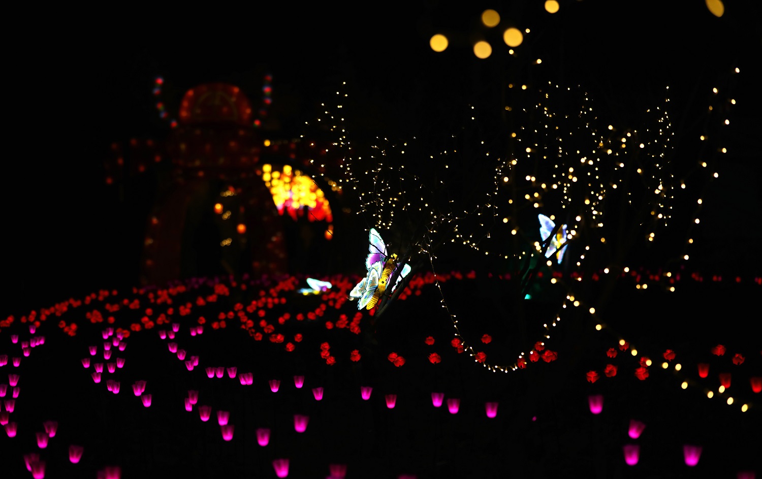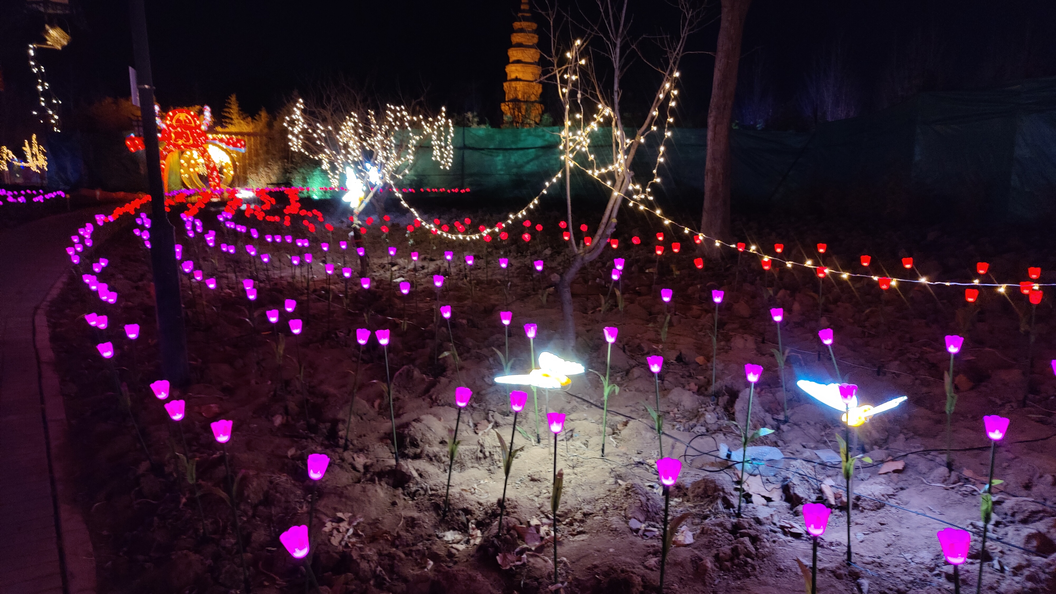 60多组造型灯组,7000多盏灯笼,近万米灯带,将宝云公园打造成了绚丽灯海。一迈入宝云公园内,首先映入眼帘的大型花灯“二龙戏珠”灯组气势恢宏,象征着龙腾盛世,吉祥如意。漫步在大红灯笼高高挂的走廊,“两岸青山相对出”“玉莲开蕊暖泉香”……一条条由古诗句组成的古风诗词条幅灯充满了诗情画意,穿上衣袂飘飘的汉服,在这打卡留念,别有一番属于中国人独有的浪漫与情怀。