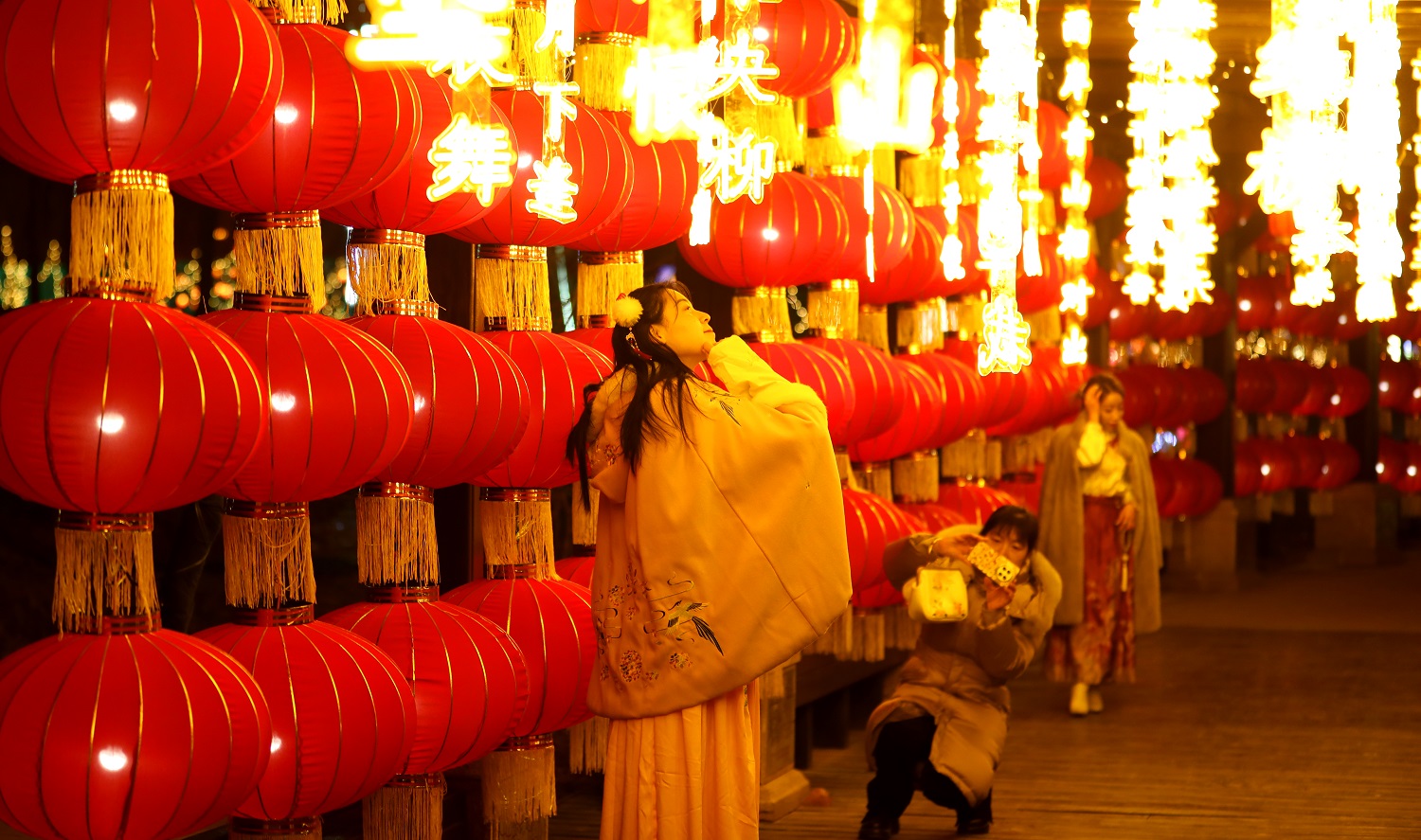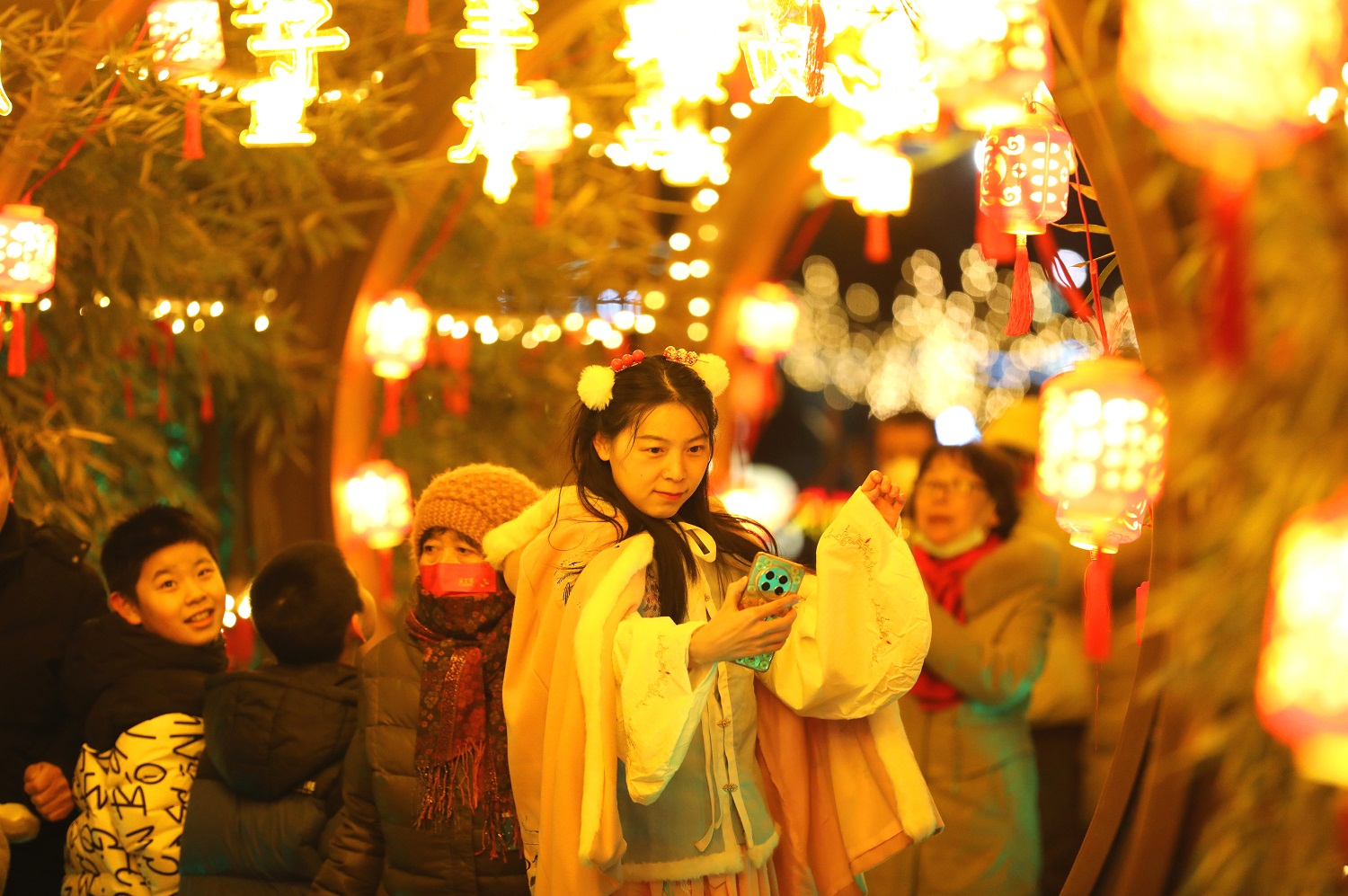 为了增加游客赏灯游园的沉浸感,灯会还设置了丰富多彩的游园活动,包括无人机表演、非遗体验、网红美食,文创集市、汉服体验等。未来几天,灯会还将开办千人相亲会、灯谜大会等活动,特别推出穿汉服免门票的惠民活动,丰富游客体验。