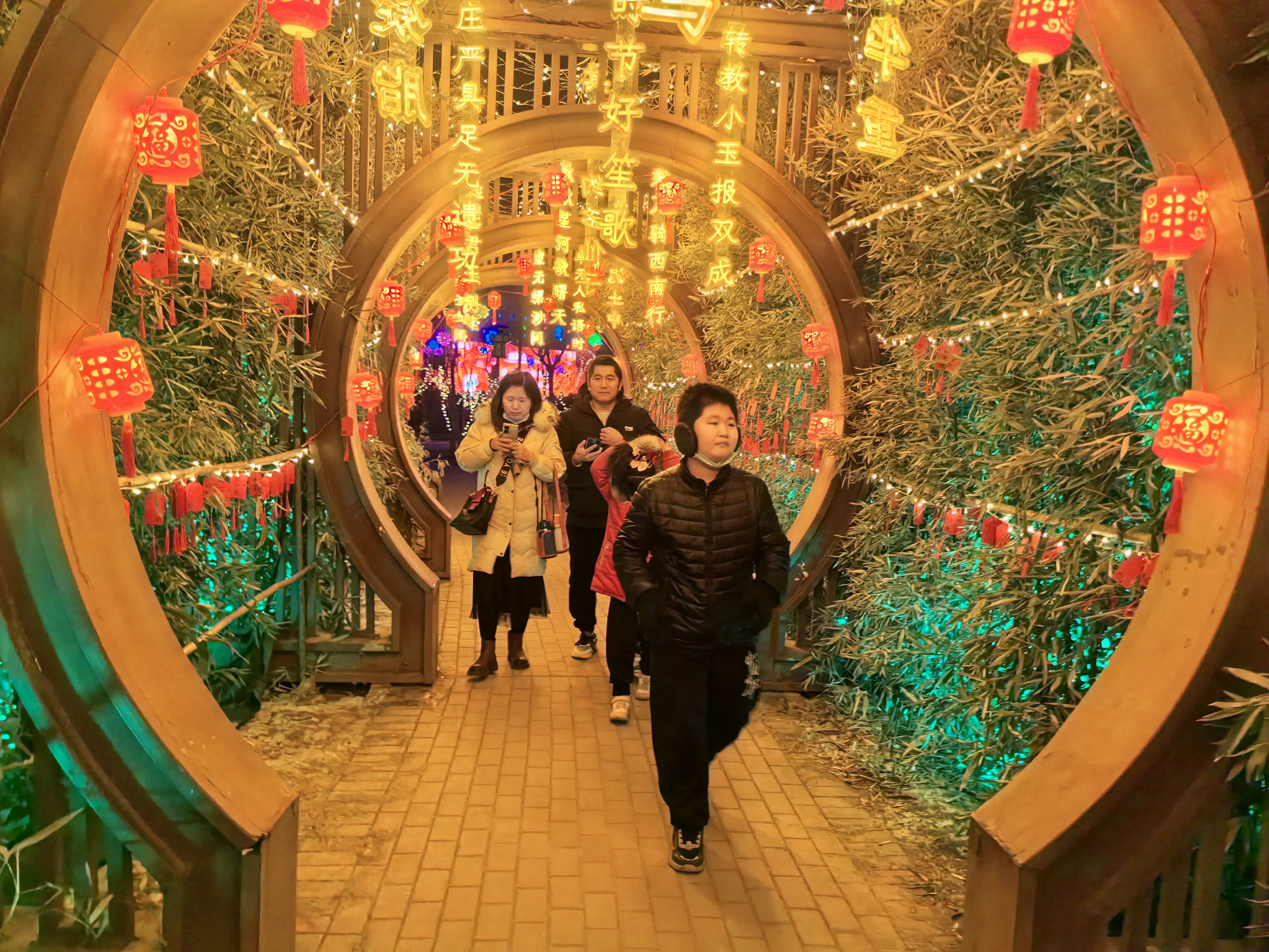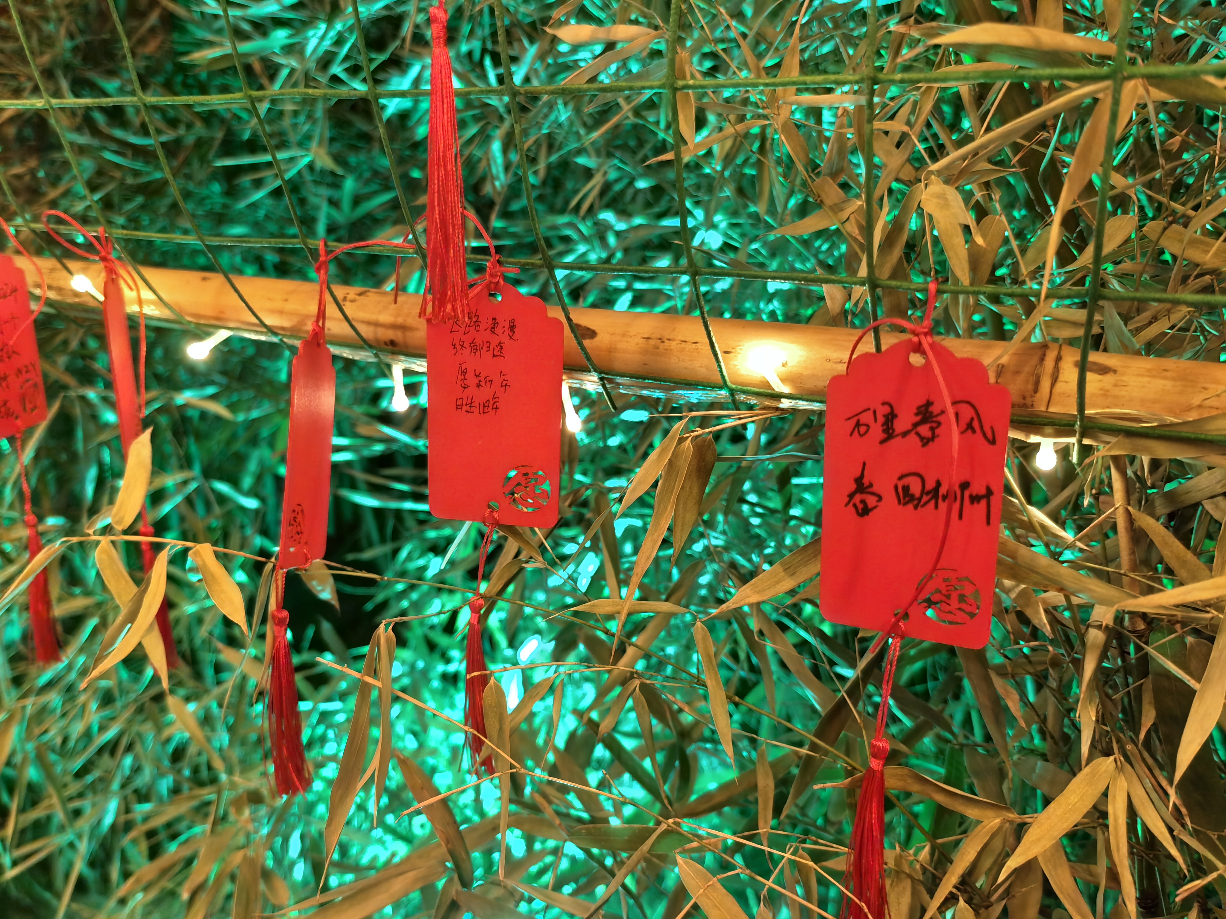 在星星点点的灯光和翠绿竹叶的映衬下,一座走廊两侧,一面面红色小牌子上写满了人们的美好祝愿,“长路漫漫终有归途,愿新年胜旧年”“万象更新”“前程似锦”,还有接地气的“工作顺利”“健健康康”“今年脱单”,路过的游客连连翻牌,共同祝愿大家都能所愿皆如愿。