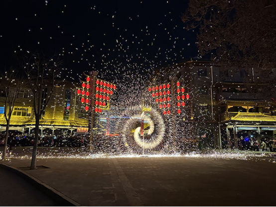 活动自2月2日持续至2月3日(农历腊月二十三至二十四),期间街区变身为一个五彩斑斓的舞台。观众在这里欣赏到了激情四溢的舞龙舞狮、惊险刺激的杂技表演、古老而神秘的打铁花技艺,以及汉服爱好者们的优雅游街。特别值得一提的是,此次活动首次引入了高科技元素——无人机表演秀。数百架无人机在夜空中编织出各种充满寓意的图案和文字,将古典与现代、科技与艺术巧妙结合,为观众带来了前所未有的视觉震撼。