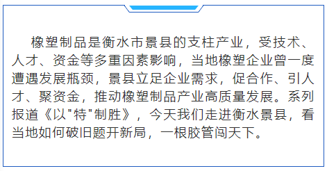 面对技术、人才、资金等困扰产业发展的多重难题,衡水景县以企业需求为出发点,从走出去请专家,到请进来建团队;从筹集专项资金,到牵线银企对接,丰盈"技术"和"人才"双翼,蓄势资金"源动力",推动橡塑制品产业实现转型升级。以"特"制胜,衡水景县:破除旧题开新局,一根胶管闯天下。、