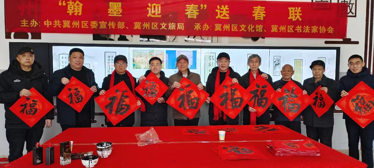 演出结束后,来自冀州区书法协会的书法爱好者们为群众现场书写、赠送春联。挥毫泼墨、笔锋舞动,一张张力透纸背的“福”字和一幅幅对仗工整、寓意吉祥的春联跃然纸上。“天增岁月人增寿,春满乾坤福临门”“福随瑞气来庭院,财伴春风入宅门”一副副寓意祥瑞的春联和充满喜气的“福”字,带着情意浓浓的墨香,送到现场群众手中,为即将到来的新春佳节增添了喜庆的氛围。