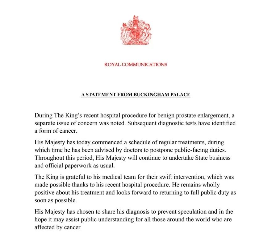 当地时间2月5日,白金汉宫发布消息称,英国国王查尔斯三世在医院的诊断检查中被确诊患有癌症。