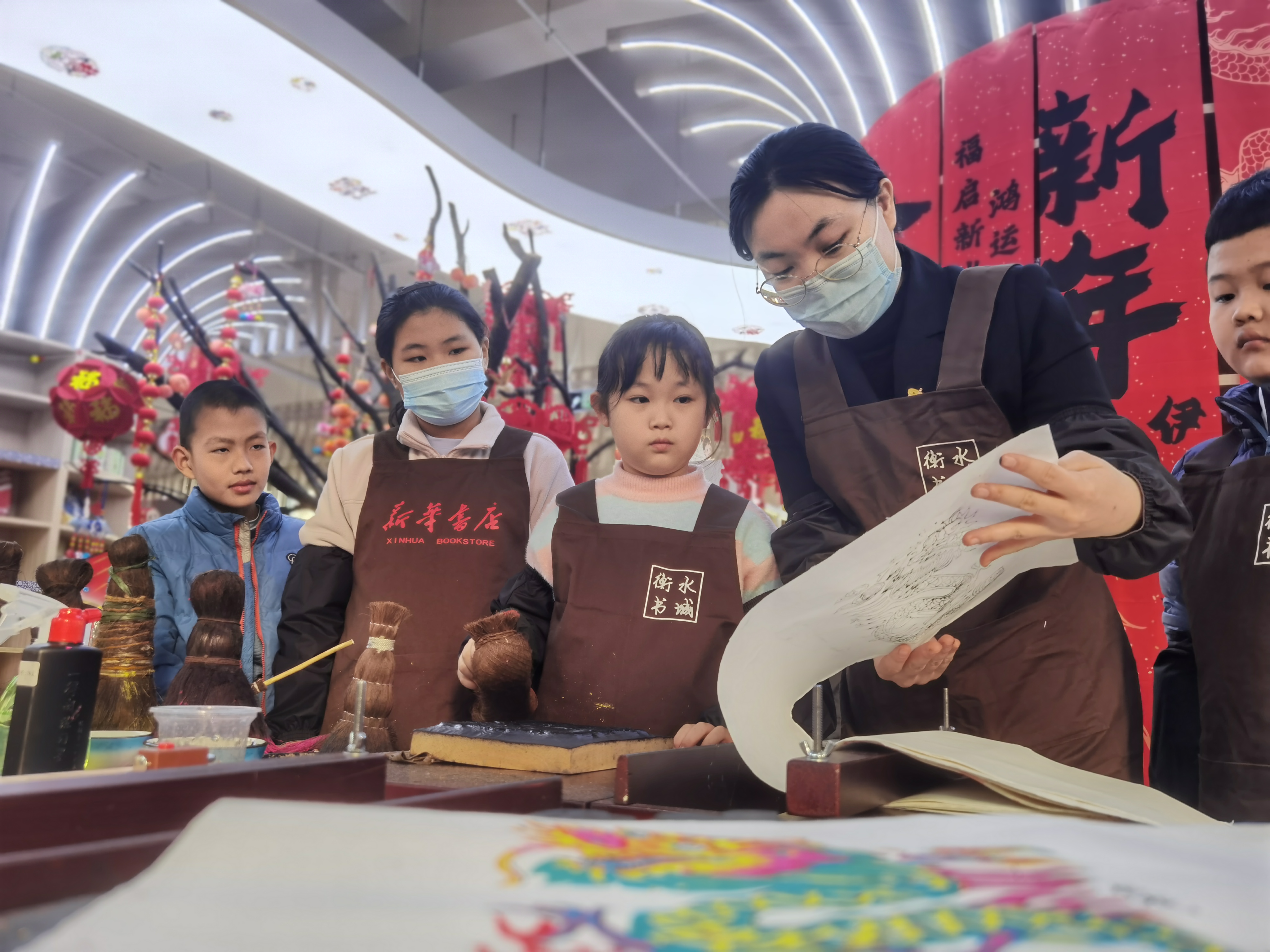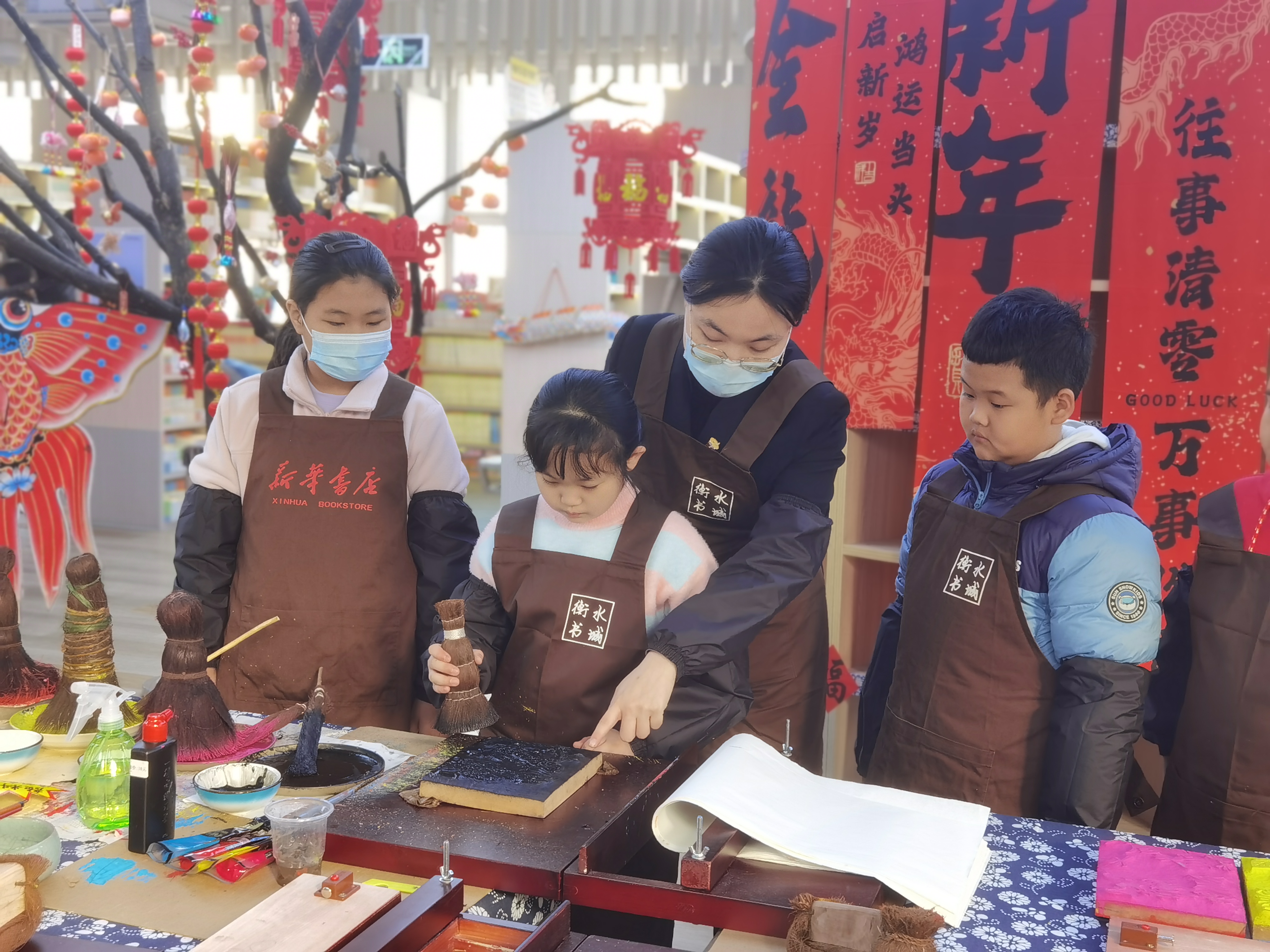 现场设置了非遗文化展示区和武强年画制作体验区。在展示区,书店工作人员向读者讲解了武强年画、剪纸的由来及发展历史、技艺特点和制作流程,带大家参观年画、剪纸等艺术佳作,展示非遗文化的独特艺术魅力。在武强年画体验区,工作人员给读者们分发拓印所需的印制工具,引导大家体验印制过程。此外,活动还单独开设了国画绘制、泥塑、剪纸、摄影等课程,安排专业老师为读者讲解、示范,引领大家领略传统文化之美。