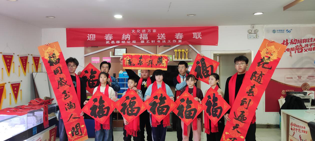 墨香四溢迎新春,妙笔生花送万福。武邑移动邀请德艺轩书法工作室为广大客户现场送福送春联。书法老师、书法爱好者、“小书法家们”展纸研磨、泼墨挥毫,执笔挥洒自如,作品大气磅礴,赢得了客户的连连称赞。