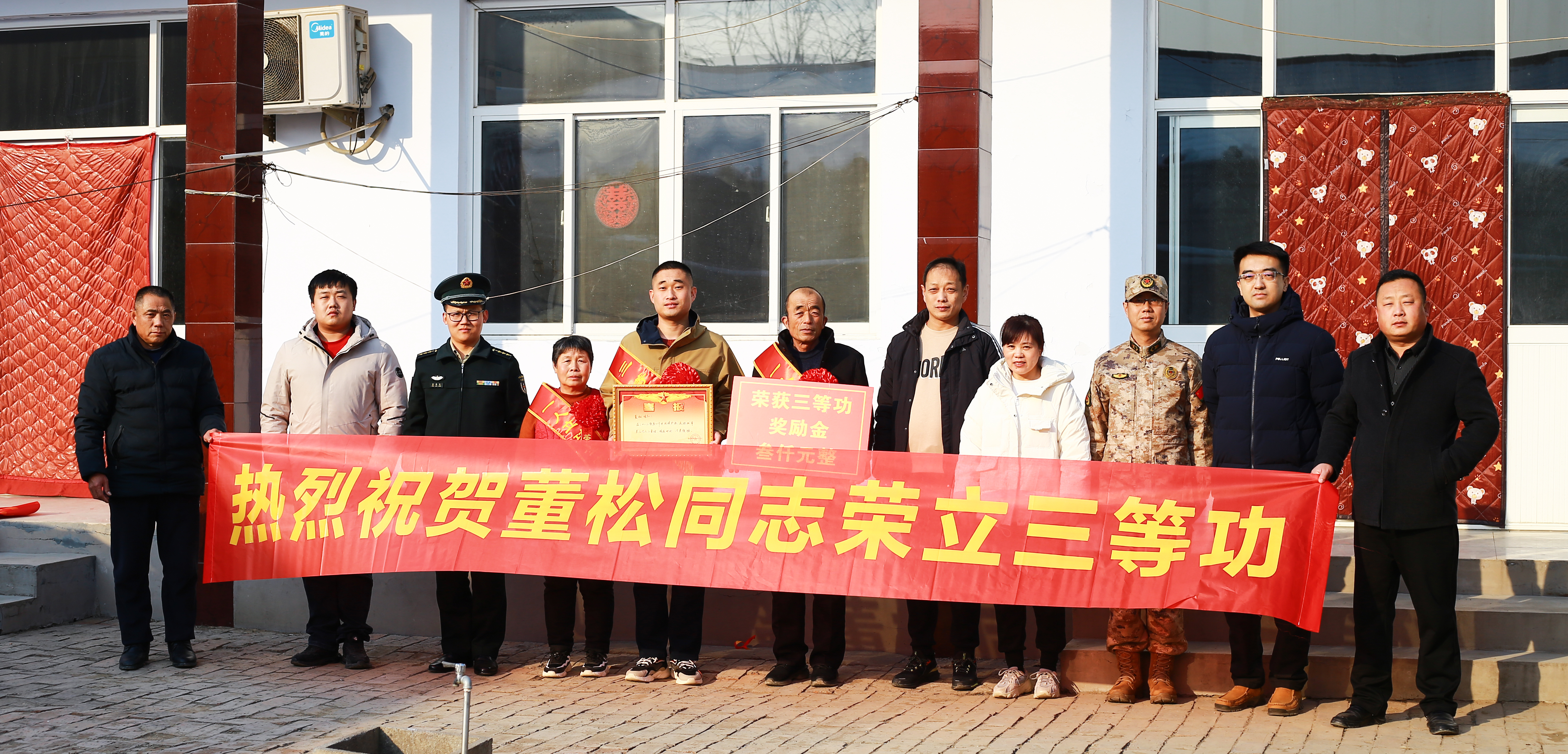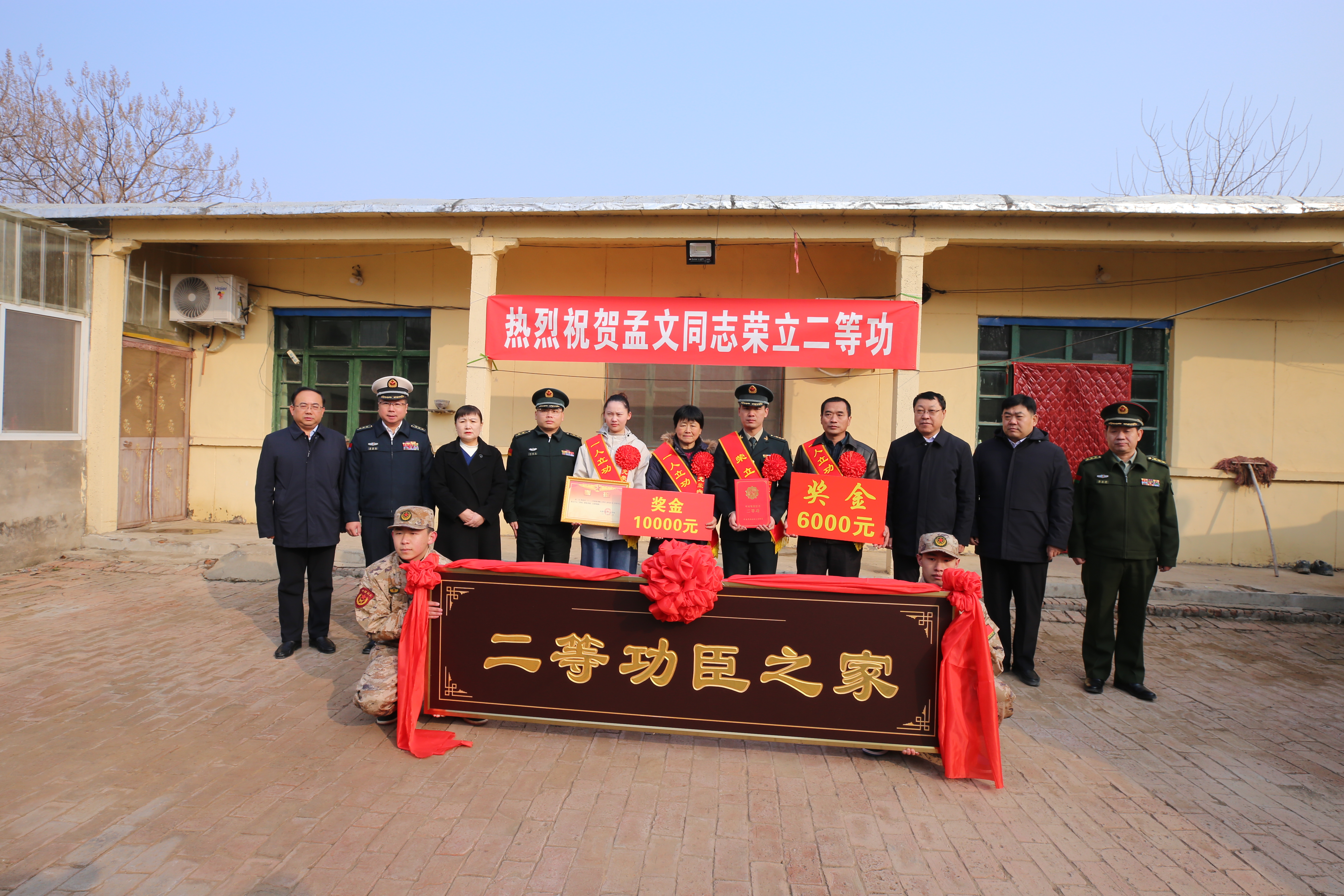 在干净、朴素的农家小院中,写着“热烈祝贺孟文同志荣立二等功”的红色条幅格外引人注目,增添了浓浓的春节气氛。在条幅前,参加活动的领导为孟文亲属披上绶带,将“二等功臣之家”牌匾和奖励金、慰问金送到他们手中。随后县领导与他们进行了亲切交谈,详细了解他们的生活情况,向功臣一家表达崇高敬意,感谢他们为国家和军队培养了一名优秀人才,以及对国防事业的支持和奉献,希望他们继续做好军人的坚强后盾,一如既往的鼓励孟文在部队安心服役,再立新功,为家乡增光添彩。