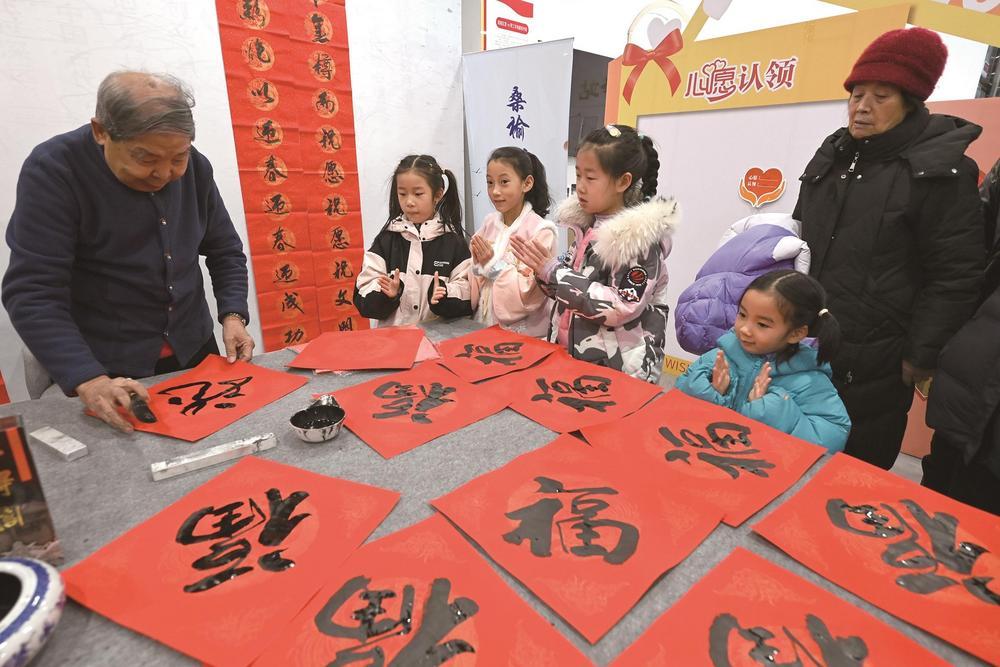 书法爱好者挥毫泼墨,祝福国泰民安。
