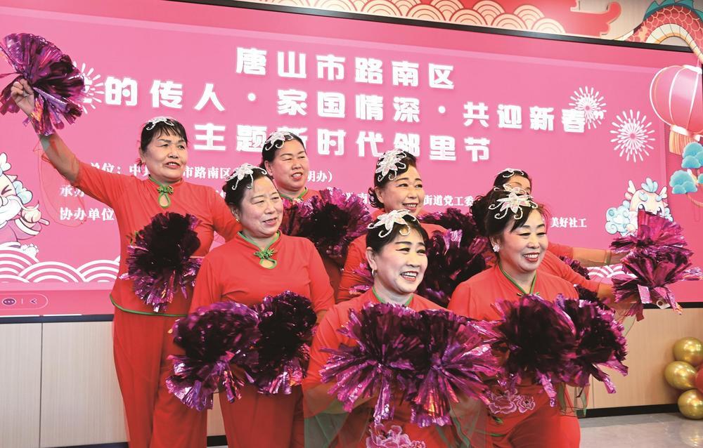 路南区梁家屯路街道初心家园服务中心里,居民载歌载舞庆新春。