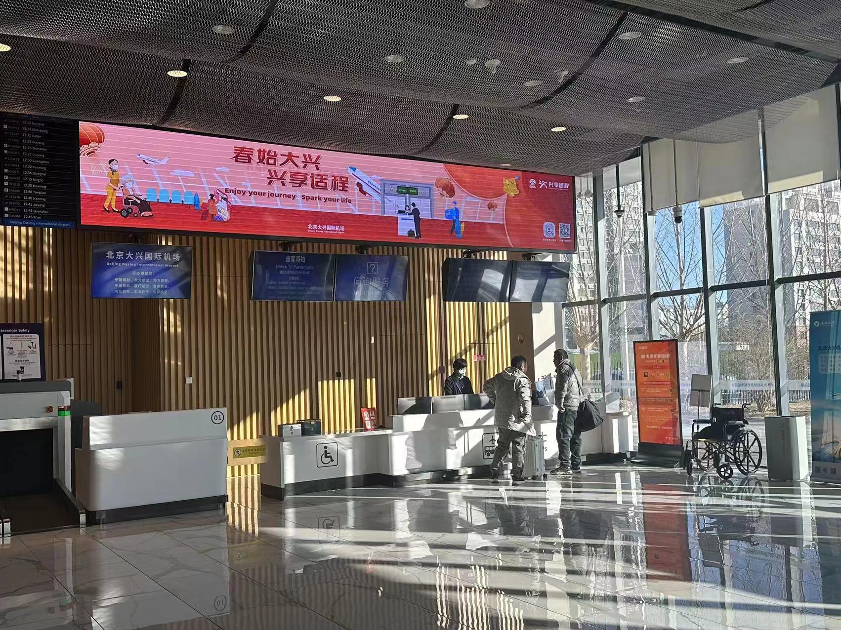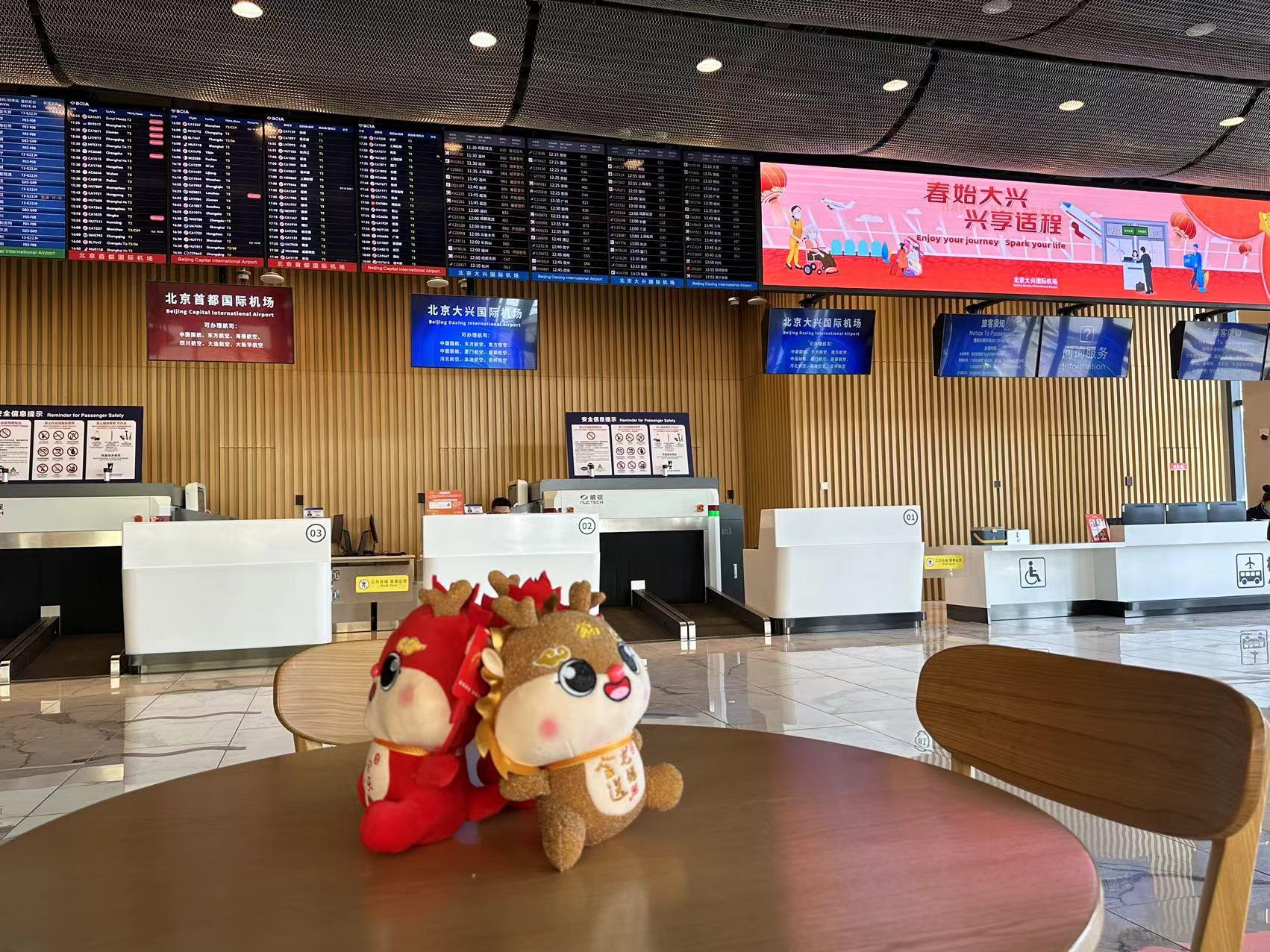 为营造热闹喜庆的新春氛围和增添旅客愉悦出行体验,大兴机场在廊坊城市航站楼布置了节日氛围装饰,设立春节主题拍照打卡装置;经城市航站楼出发的儿童旅客和龙年出生的旅客可在柜台领取龙年纪念小礼物一份。等候乘车时,儿童旅客可在廊坊城市航站楼候车区观看儿童动画片,出行体验更温馨舒适。