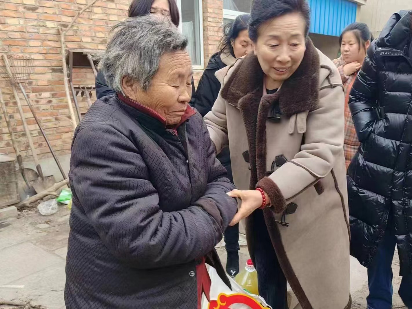 “阿姨,过年啦,我们来看看您!咱家过年还缺啥不?春联‘福’字都备齐了吗……”