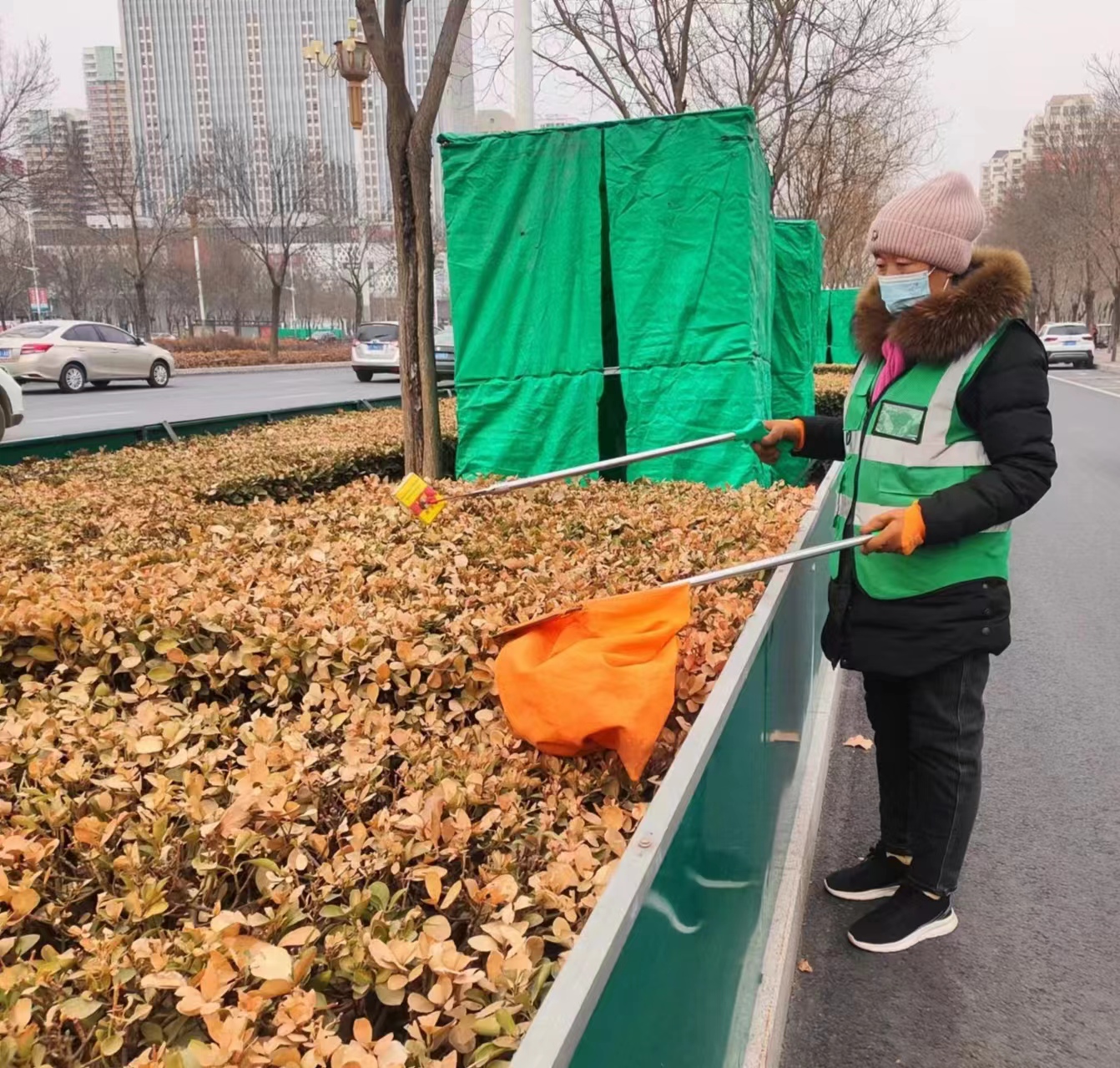 当日上午8时30分许,记者在前进大街人民路至胜利路段看到,20多名身着绿马甲的园林工人俯身、弯腰用镊子、耙子等各类工具,对隐藏在绿化带中的枯枝落叶及塑料袋、烟头等垃圾进行全面细致清理,对存在的卫生死角进行彻底清除。同时,他们还不忘向沿街门店及附近居民发出共建洁净街道的倡议,倡导每位市民从自身做起,从点滴做起,自觉维护市区街道、绿化带卫生的整洁,培养良好的卫生习惯,引导大家做文明好商户、好居民。